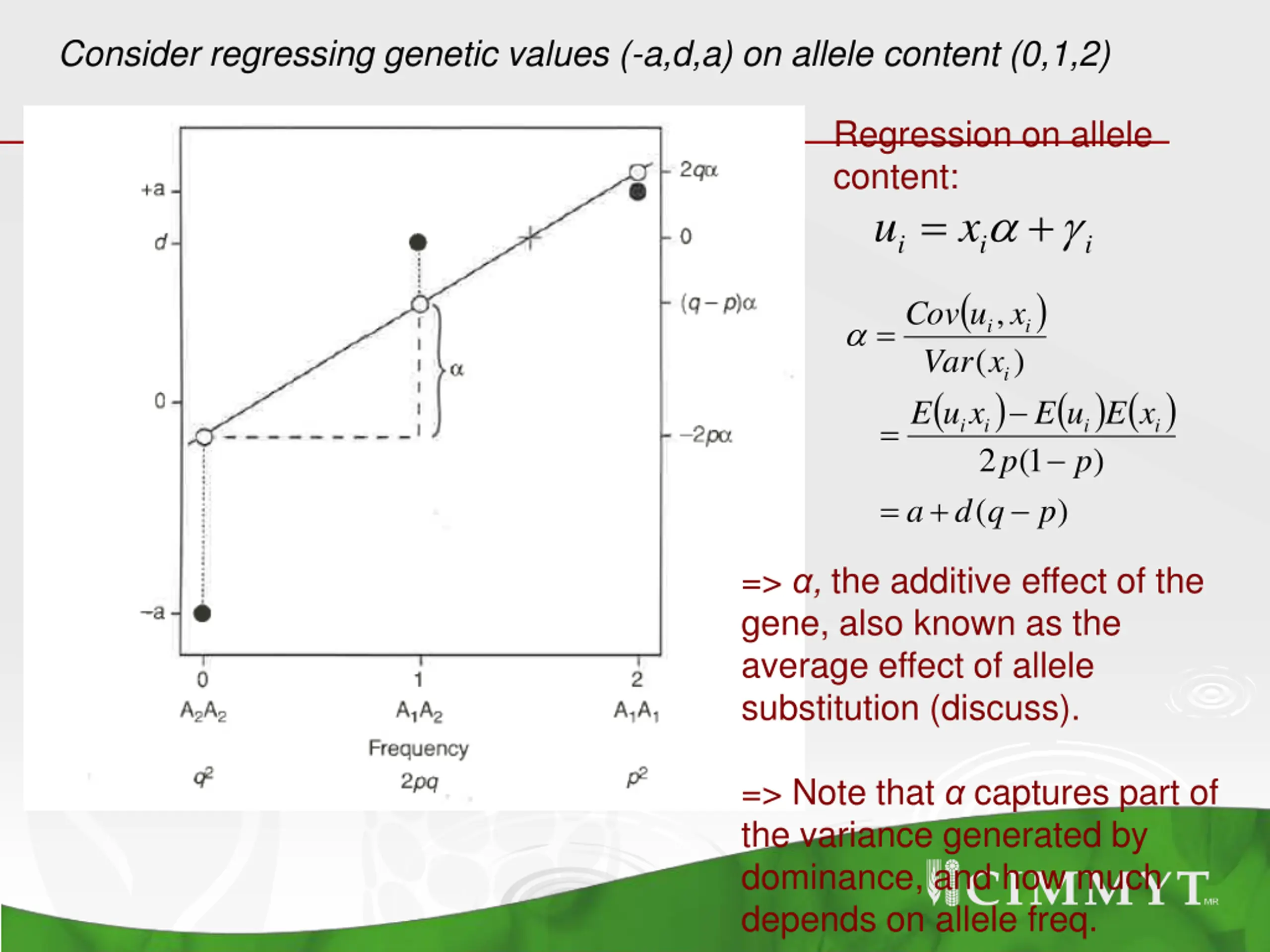 Consider regressing genetic values (-a,d,a) on allele content (0,1,2) Regression on allele content: x u + = i i i ( ) , Cov u x = i i ( ) Var x i ( ) ( ) ( ) ) p E u x E u E x = i i i i 2 q 1 ( p = + ( ) a d p => , the additive effect of the gene, also known as the average effect of allele substitution (discuss). => Note that captures part of the variance generated by dominance, and how much depends on allele freq.