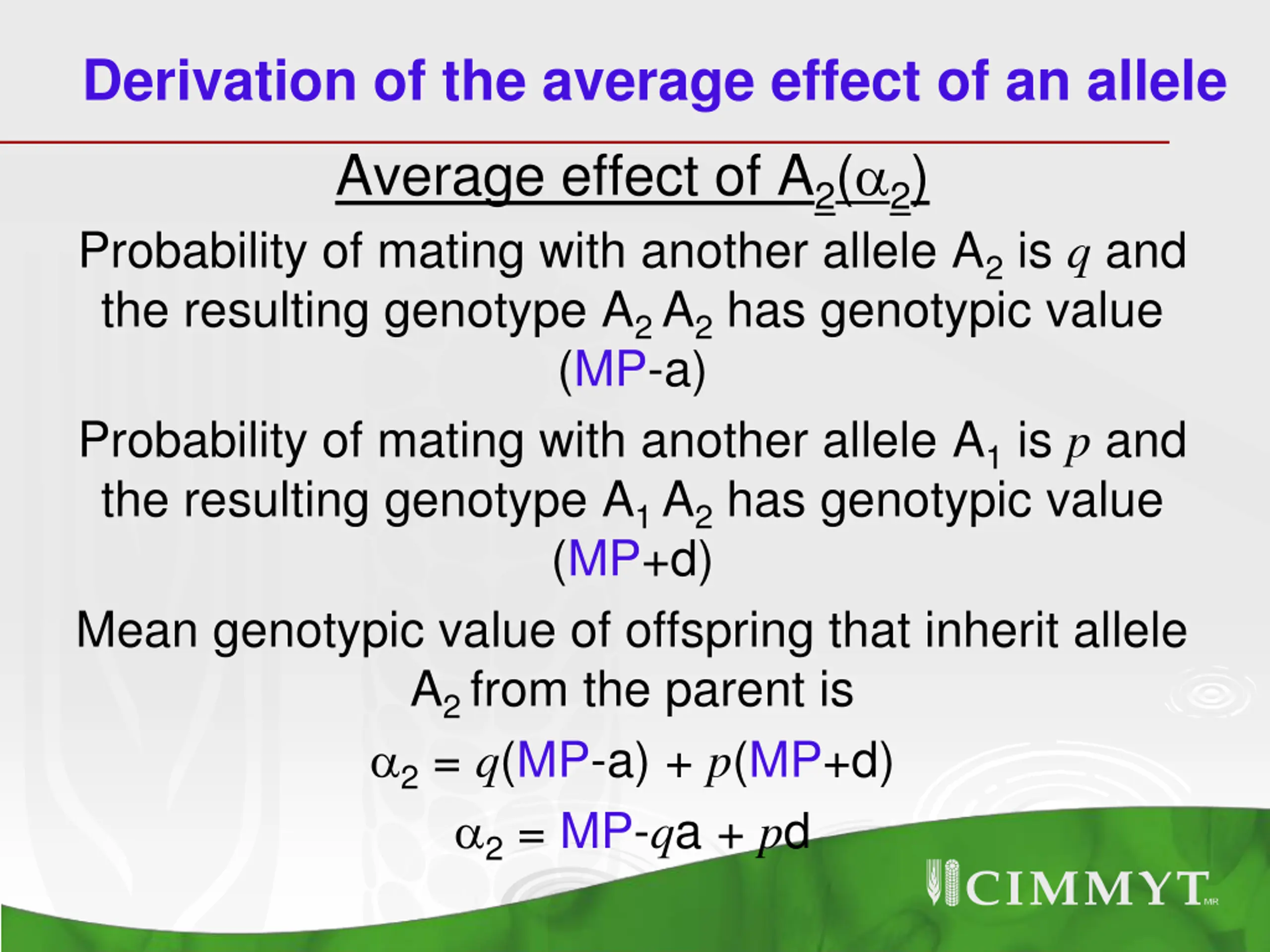 Derivation of the average effect of an allele Average effect of A2( 2) Probability of mating with another allele A2 is q and the resulting genotype A2 A2 has genotypic value (MP-a) Probability of mating with another allele A1 is p and the resulting genotype A1 A2 has genotypic value (MP+d) Mean genotypic value of offspring that inherit allele A2 from the parent is 2 = q(MP-a) + p(MP+d) 2 = MP-qa + pd