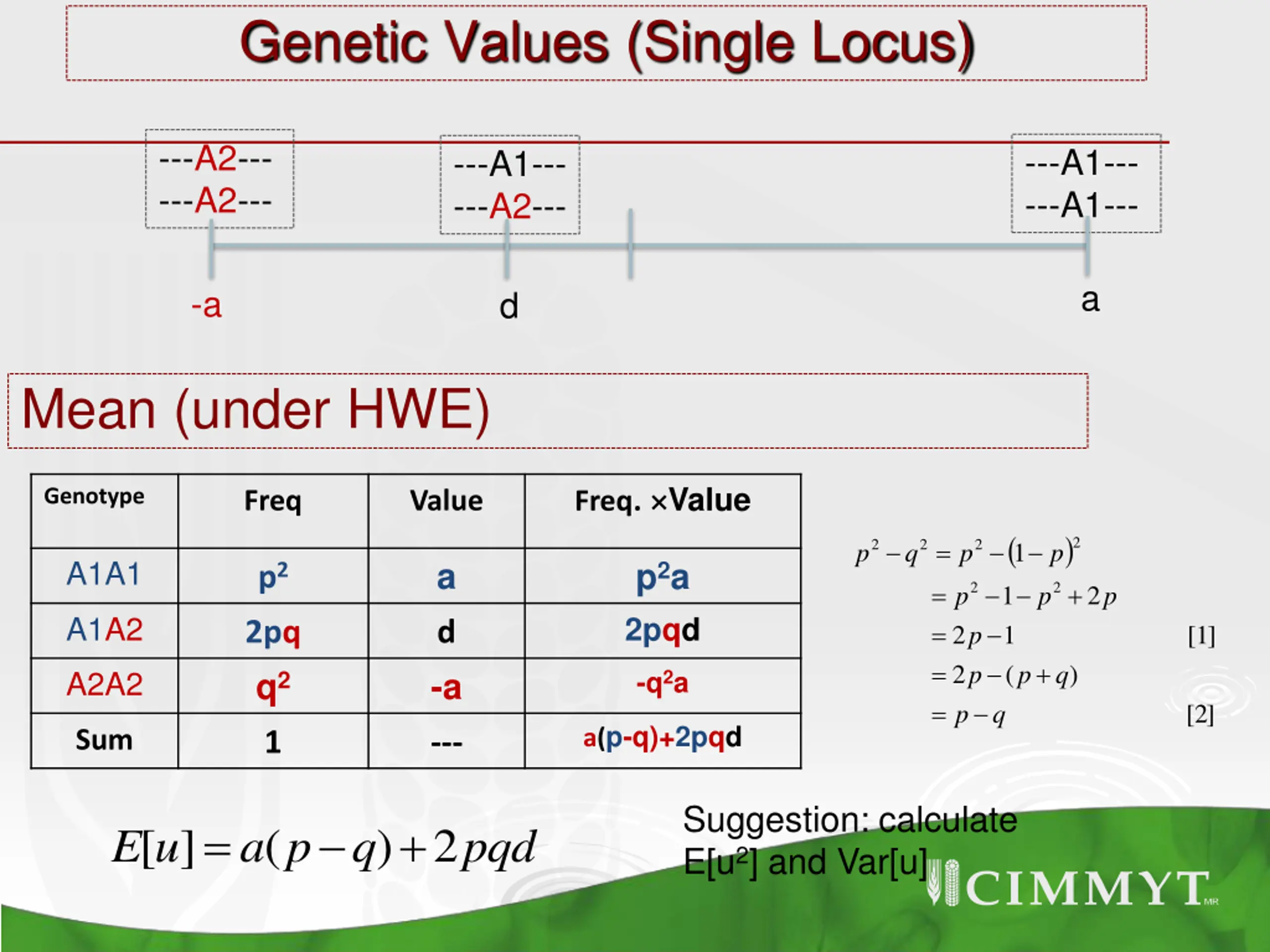 Genetic Values (Single Locus) ---A2--- ---A2--- ---A1--- ---A1--- ---A1--- ---A2--- a -a d Mean (under HWE) Freq. Value Genotype Freq Value ( ) + 2 = 2 2 2 1 p q p p A1A1 a p2a 2pqd p2 = 2 2 1 2 p p p A1A2 2pq q2 d -a = 2 1 p + [1] p = 2 p ( ) p q A2A2 -q2a = q [2] a(p-q)+2pqd Sum 1 --- Suggestion: calculate E[u2] and Var[u] = + [ ] ( ) 2 E u a p q pqd