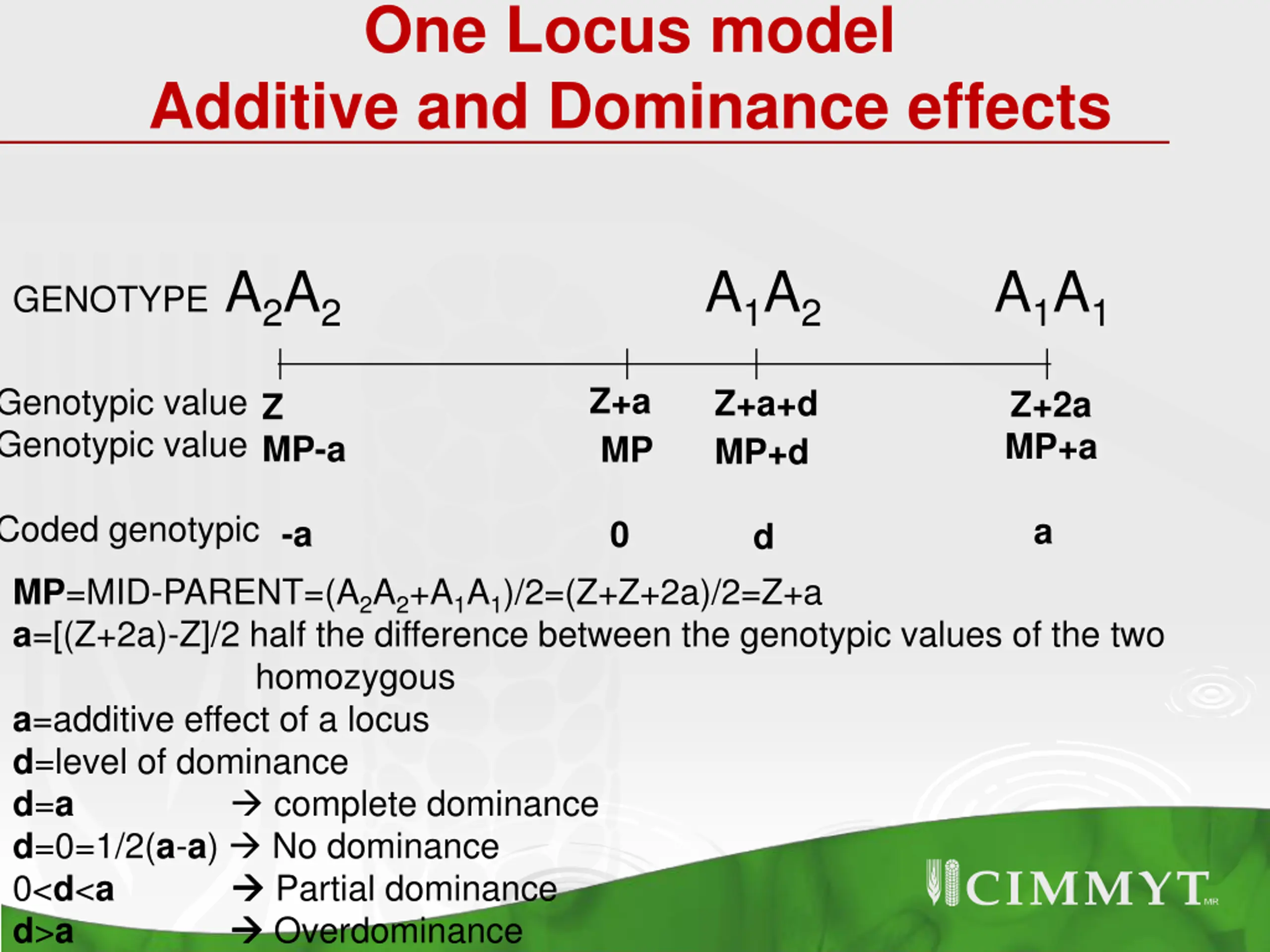 One Locus model Additive and Dominance effects GENOTYPE A2A2 A1A2 A1A1 Z+a Genotypic value Genotypic value Z+a+d MP+d Z+2a MP+a Z MP-a MP Coded genotypic a -a 0 d MP=MID-PARENT=(A2A2+A1A1)/2=(Z+Z+2a)/2=Z+a a=[(Z+2a)-Z]/2 half the difference between the genotypic values of the two homozygous a=additive effect of a locus d=level of dominance d=a complete dominance d=0=1/2(a-a) No dominance 0<d<a Partial dominance d>a Overdominance