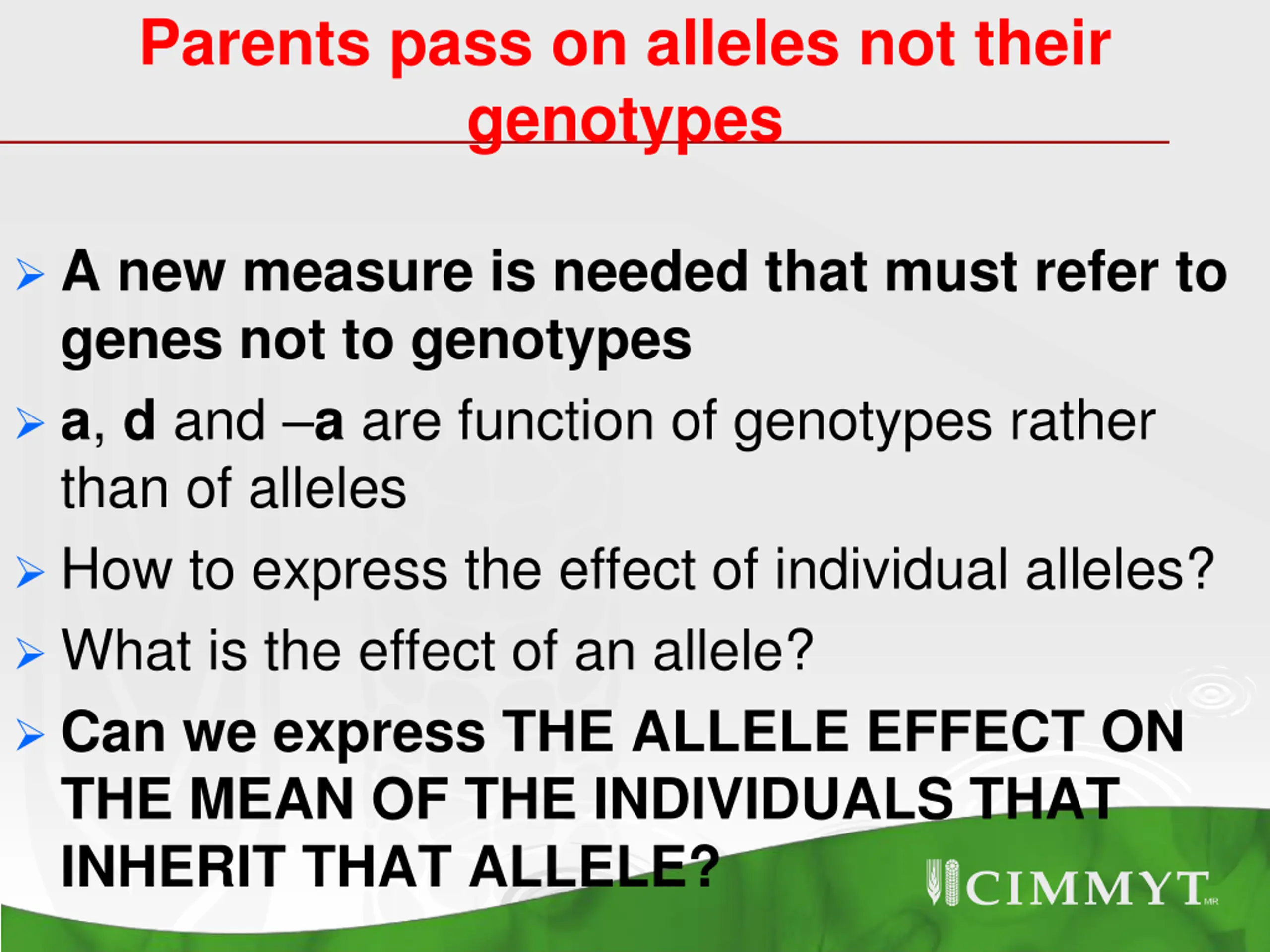 Parents pass on alleles not their genotypes A new measure is needed that must refer to genes not to genotypes a, d and a are function of genotypes rather than of alleles How to express the effect of individual alleles? What is the effect of an allele? Can we express THE ALLELE EFFECT ON THE MEAN OF THE INDIVIDUALS THAT INHERIT THAT ALLELE?