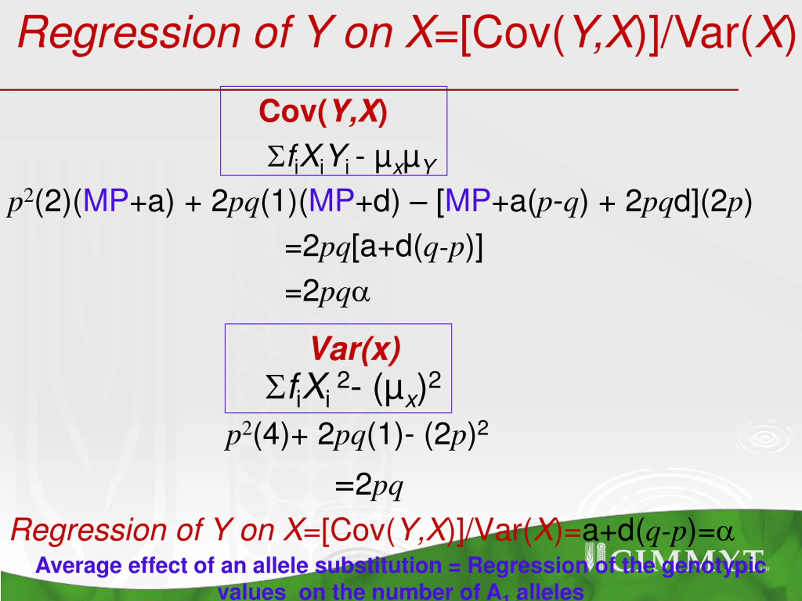 Regression of Y on X=[Cov(Y,X)]/Var(X) Cov(Y,X) fiXiYi - x Y p2(2)(MP+a) + 2pq(1)(MP+d) [MP+a(p-q) + 2pqd](2p) =2pq[a+d(q-p)] =2pq Var(x) fiXi 2- ( x)2 p2(4)+ 2pq(1)- (2p)2 =2pq Regression of Y on X=[Cov(Y,X)]/Var(X)=a+d(q-p)= Average effect of an allele substitution = Regression of the genotypic values on the number of A1 alleles