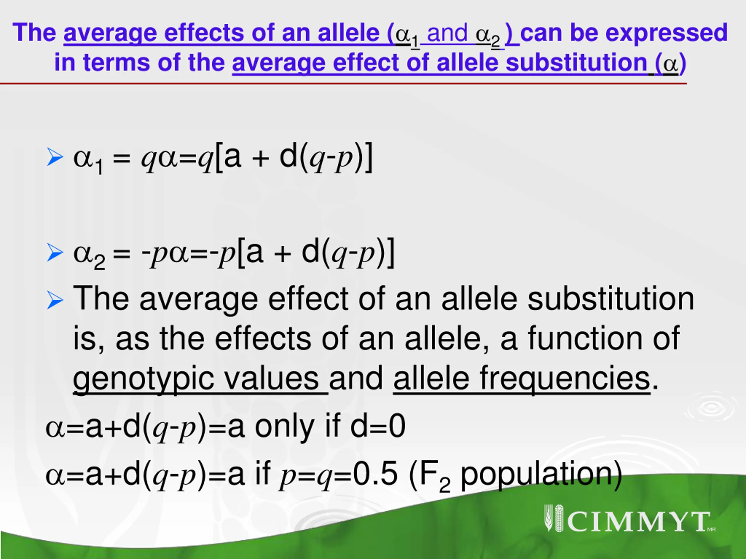 The average effects of an allele (1and 2) can be expressed in terms of the average effect of allele substitution ( ) 1 = q =q[a + d(q-p)] 2 = -p =-p[a + d(q-p)] The average effect of an allele substitution is, as the effects of an allele, a function of genotypic values and allele frequencies. =a+d(q-p)=a only if d=0 =a+d(q-p)=a if p=q=0.5 (F2 population)