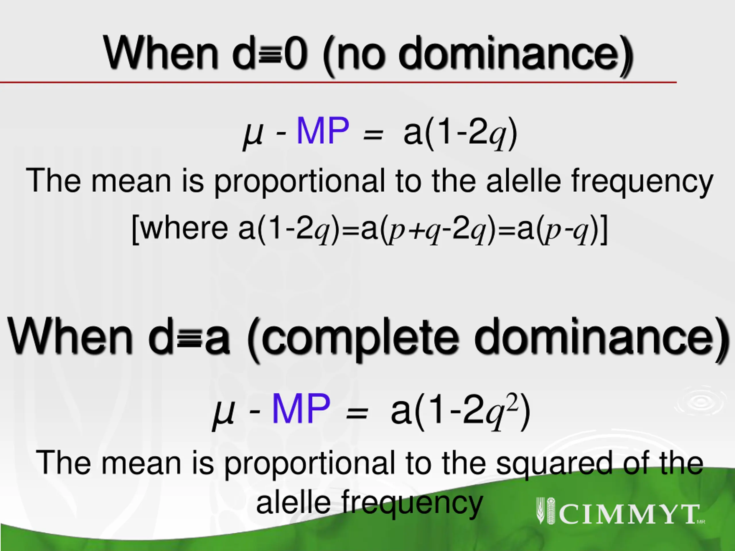 When d=0 (no dominance) - MP = a(1-2q) The mean is proportional to the alelle frequency [where a(1-2q)=a(p+q-2q)=a(p-q)] When d=a (complete dominance) - MP = a(1-2q2) The mean is proportional to the squared of the alelle frequency