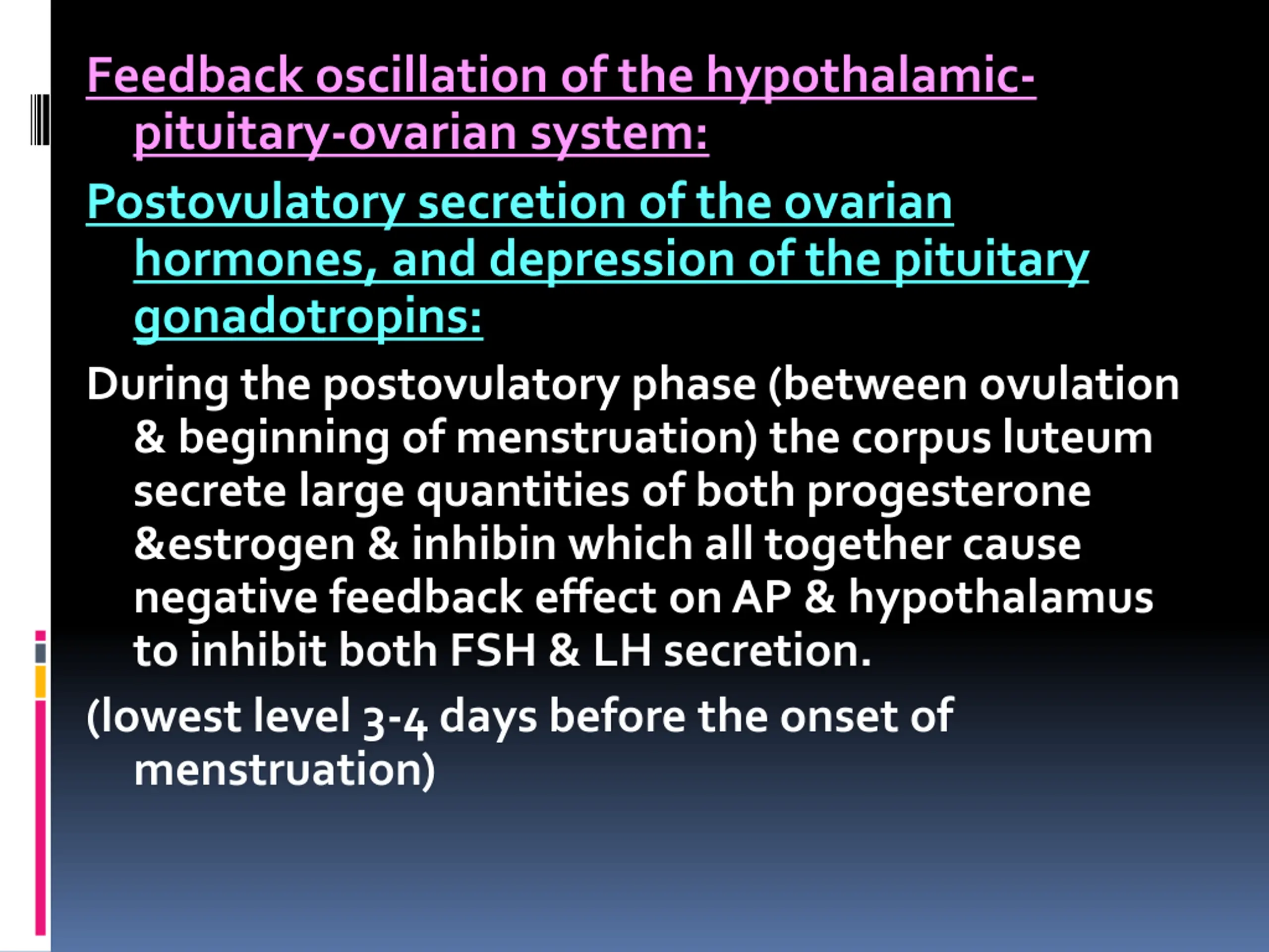 Feedback oscillation of the hypothalamic- pituitary-ovarian system: Postovulatory secretion of the ovarian hormones, and depression of the pituitary gonadotropins: During the postovulatory phase (between ovulation & beginning of menstruation) the corpus luteum secrete large quantities of both progesterone &estrogen & inhibin which all together cause negative feedback effect on AP & hypothalamus to inhibit both FSH & LH secretion. (lowest level 3-4 days before the onset of menstruation)