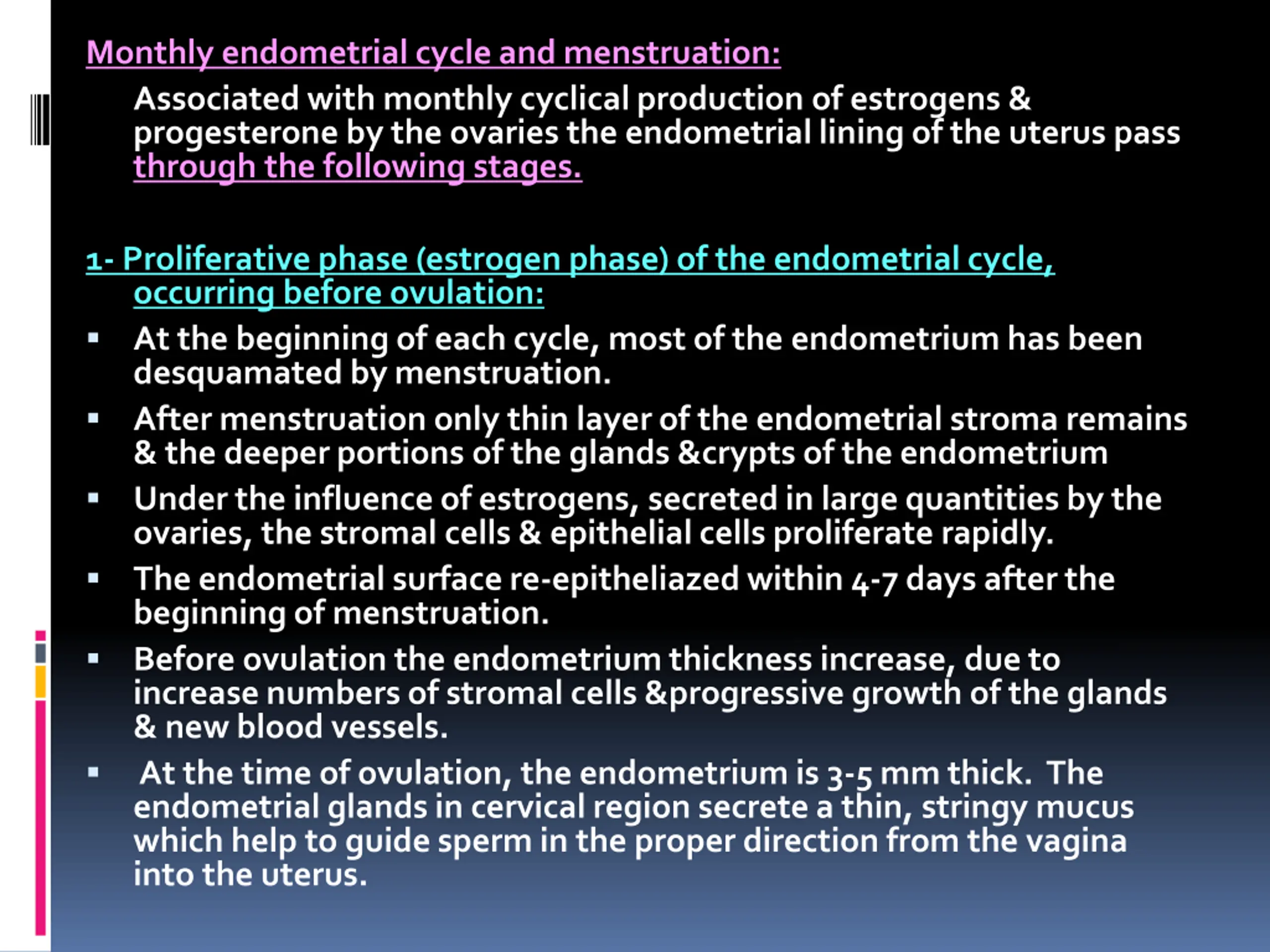 Monthly endometrial cycle and menstruation: Associated with monthly cyclical production of estrogens & progesterone by the ovaries the endometrial lining of the uterus pass through the following stages. 1- Proliferative phase (estrogen phase) of the endometrial cycle, occurring before ovulation: At the beginning of each cycle, most of the endometrium has been desquamated by menstruation. After menstruation only thin layer of the endometrial stroma remains & the deeper portions of the glands &crypts of the endometrium Under the influence of estrogens, secreted in large quantities by the ovaries, the stromal cells & epithelial cells proliferate rapidly. The endometrial surface re-epitheliazedwithin 4-7 days after the beginning of menstruation. Before ovulation the endometriumthickness increase, due to increase numbers of stromal cells &progressive growth of the glands & new blood vessels. At the time of ovulation, the endometriumis 3-5 mm thick. The endometrial glands in cervical region secrete a thin, stringy mucus which help to guide sperm in the proper direction from the vagina into the uterus.