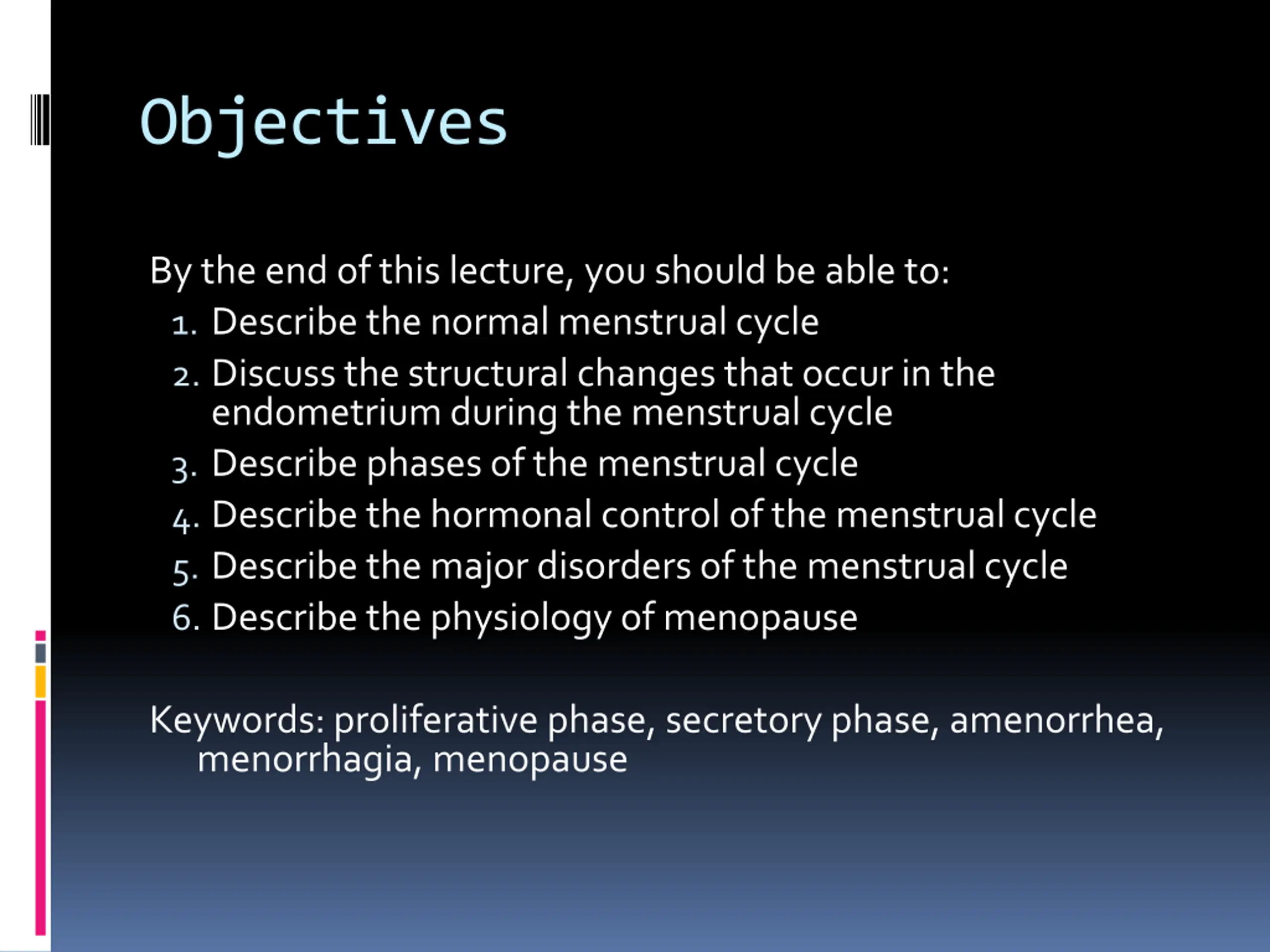 Objectives By the end of this lecture, you should be able to: 1. Describe the normal menstrual cycle 2. Discuss the structural changes that occur in the endometriumduring the menstrual cycle 3. Describe phases of the menstrual cycle 4. Describe the hormonal control of the menstrual cycle 5. Describe the major disorders of the menstrual cycle 6. Describe the physiology of menopause Keywords: proliferative phase, secretoryphase, amenorrhea, menorrhagia, menopause