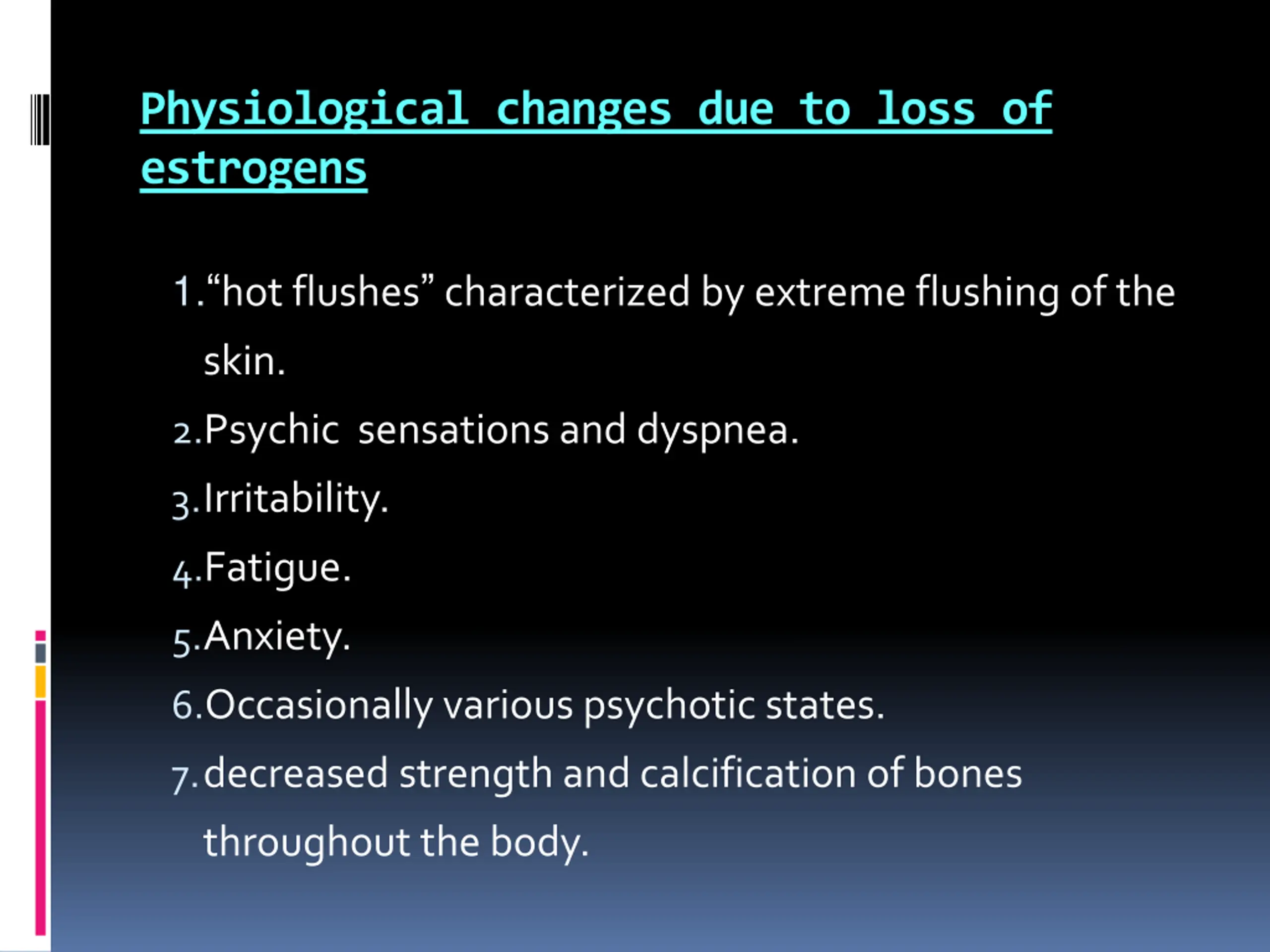 Physiological changes due to loss of estrogens 1. hot flushes characterized by extreme flushing of the skin. 2.Psychic sensations and dyspnea. 3.Irritability. 4.Fatigue. 5.Anxiety. 6.Occasionally various psychotic states. 7.decreased strength and calcification of bones throughout the body.