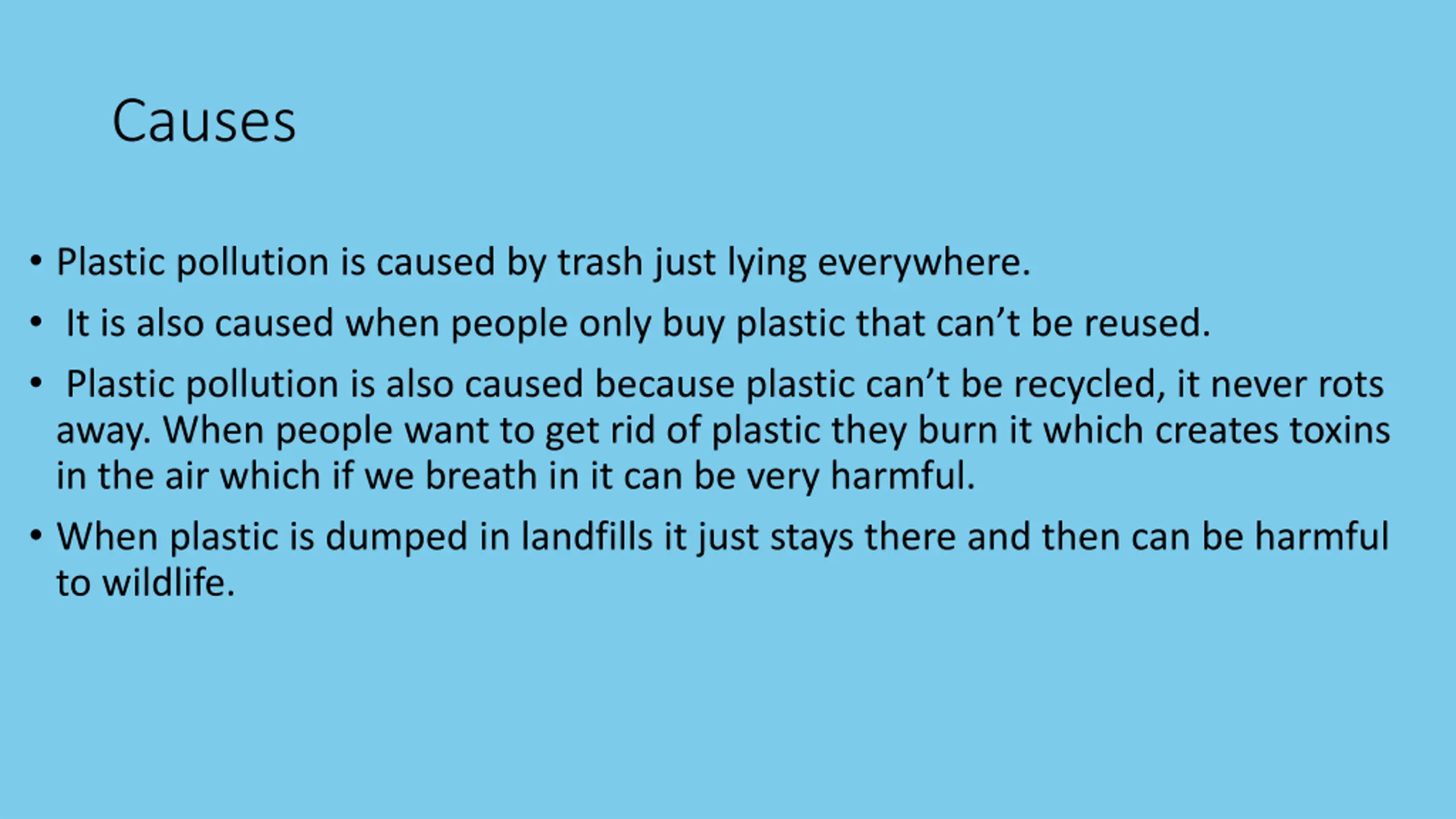 Causes Plastic pollution is caused by trash just lying everywhere. It is also caused when people only buy plastic that can t be reused. Plastic pollution is also caused because plastic can t be recycled, it never rots away. When people want to get rid of plastic they burn it which creates toxins in the air which if we breath in it can be very harmful. When plastic is dumped in landfills it just stays there and then can be harmful to wildlife.