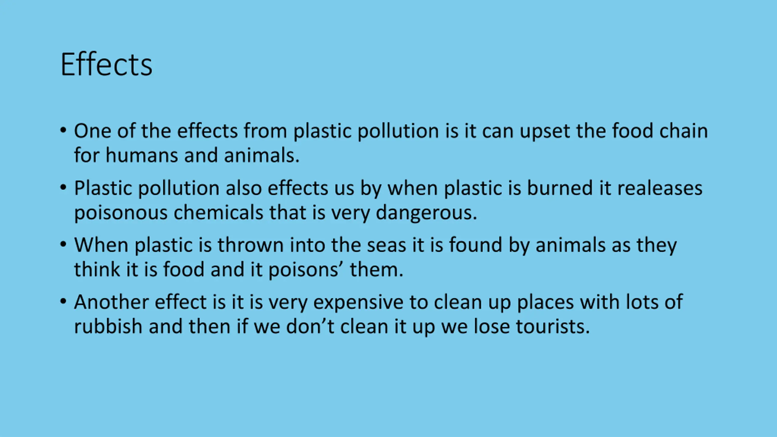 Effects One of the effects from plastic pollution is it can upset the food chain for humans and animals. Plastic pollution also effects us by when plastic is burned it realeases poisonous chemicals that is very dangerous. When plastic is thrown into the seas it is found by animals as they think it is food and it poisons them. Another effect is it is very expensive to clean up places with lots of rubbish and then if we don t clean it up we lose tourists.