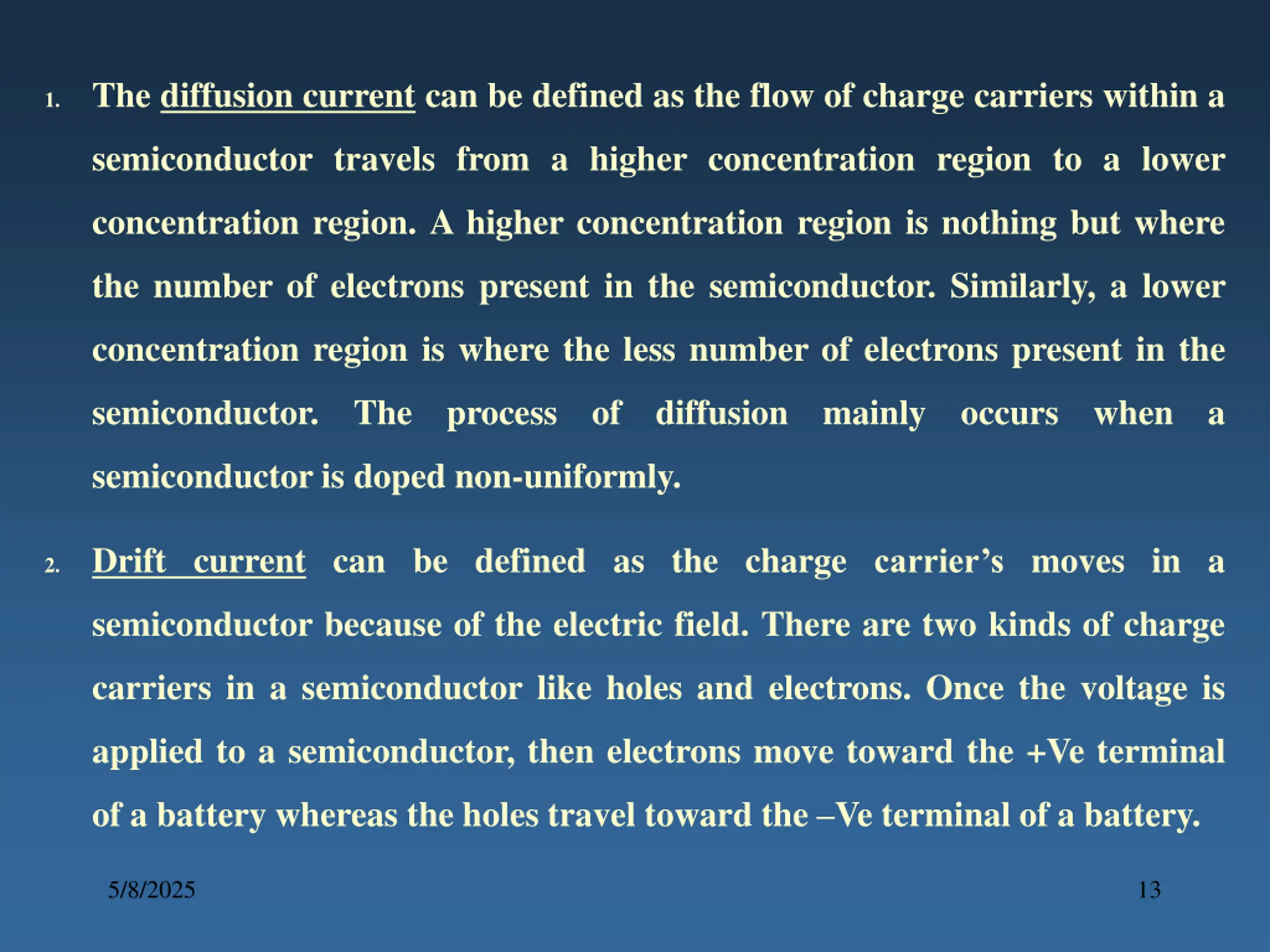 1. The diffusion current can be defined as the flow of charge carriers within a semiconductor travels from a higher concentration region to a lower concentration region. A higher concentration region is nothing but where the number of electrons present in the semiconductor. Similarly, a lower concentration region is where the less number of electrons present in the semiconductor. The process of diffusion mainly occurs when a semiconductor is doped non-uniformly. 2. Drift current can be defined as the charge carrier s moves in a semiconductor because of the electric field. There are two kinds of charge carriers in a semiconductor like holes and electrons. Once the voltage is applied to a semiconductor, then electrons move toward the +Ve terminal of a battery whereas the holes travel toward the Ve terminal of a battery. 5/8/2025 13