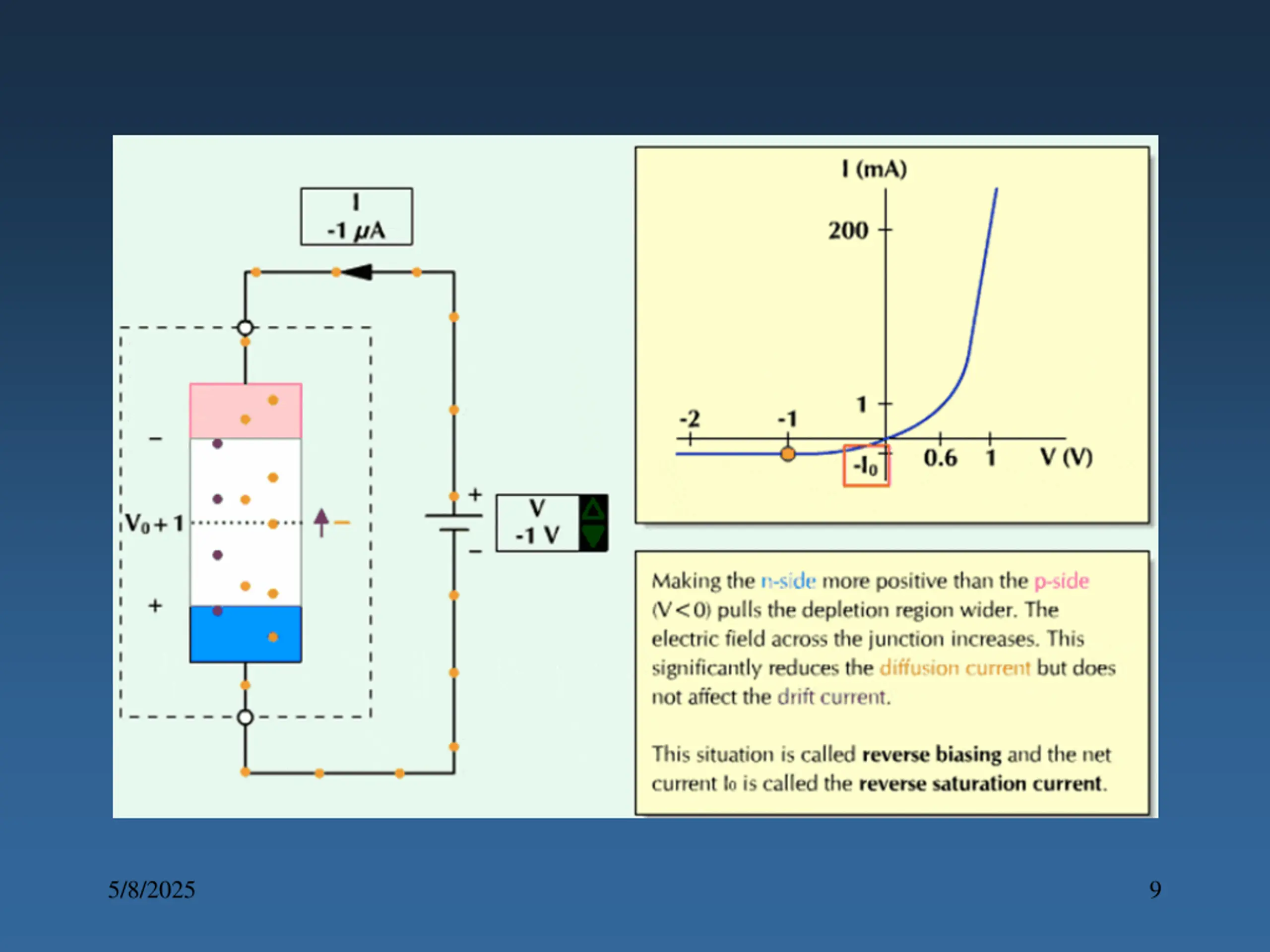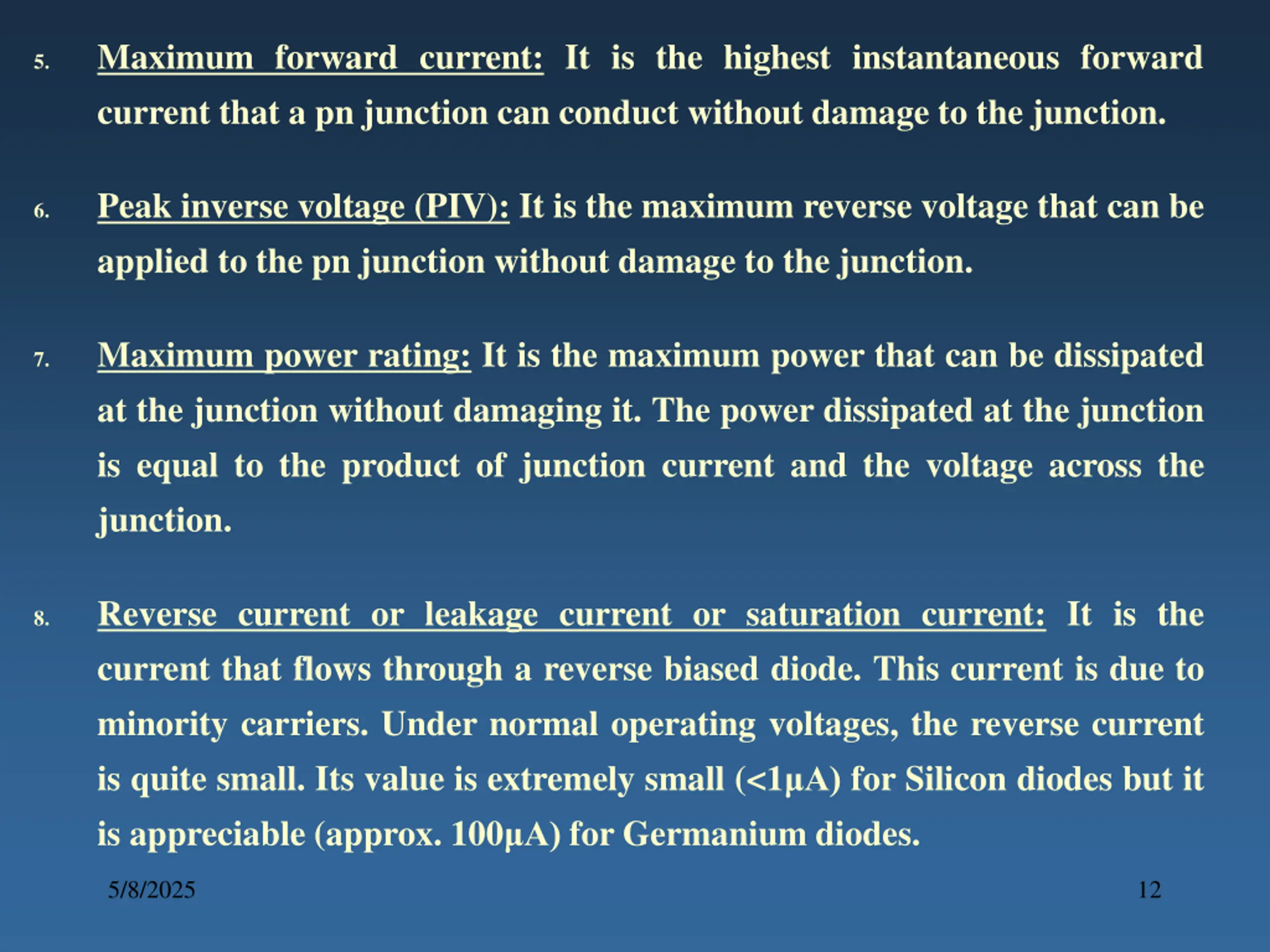 Maximum forward current: It is the highest instantaneous forward current that a pn junction can conduct without damage to the junction. 5. Peak inverse voltage (PIV): It is the maximum reverse voltage that can be applied to the pn junction without damage to the junction. 6. Maximum power rating: It is the maximum power that can be dissipated at the junction without damaging it. The power dissipated at the junction is equal to the product of junction current and the voltage across the junction. 7. Reverse current or leakage current or saturation current: It is the current that flows through a reverse biased diode. This current is due to minority carriers. Under normal operating voltages, the reverse current is quite small. Its value is extremely small (<1 A) for Silicon diodes but it is appreciable (approx. 100 A) for Germanium diodes. 8. 5/8/2025 12