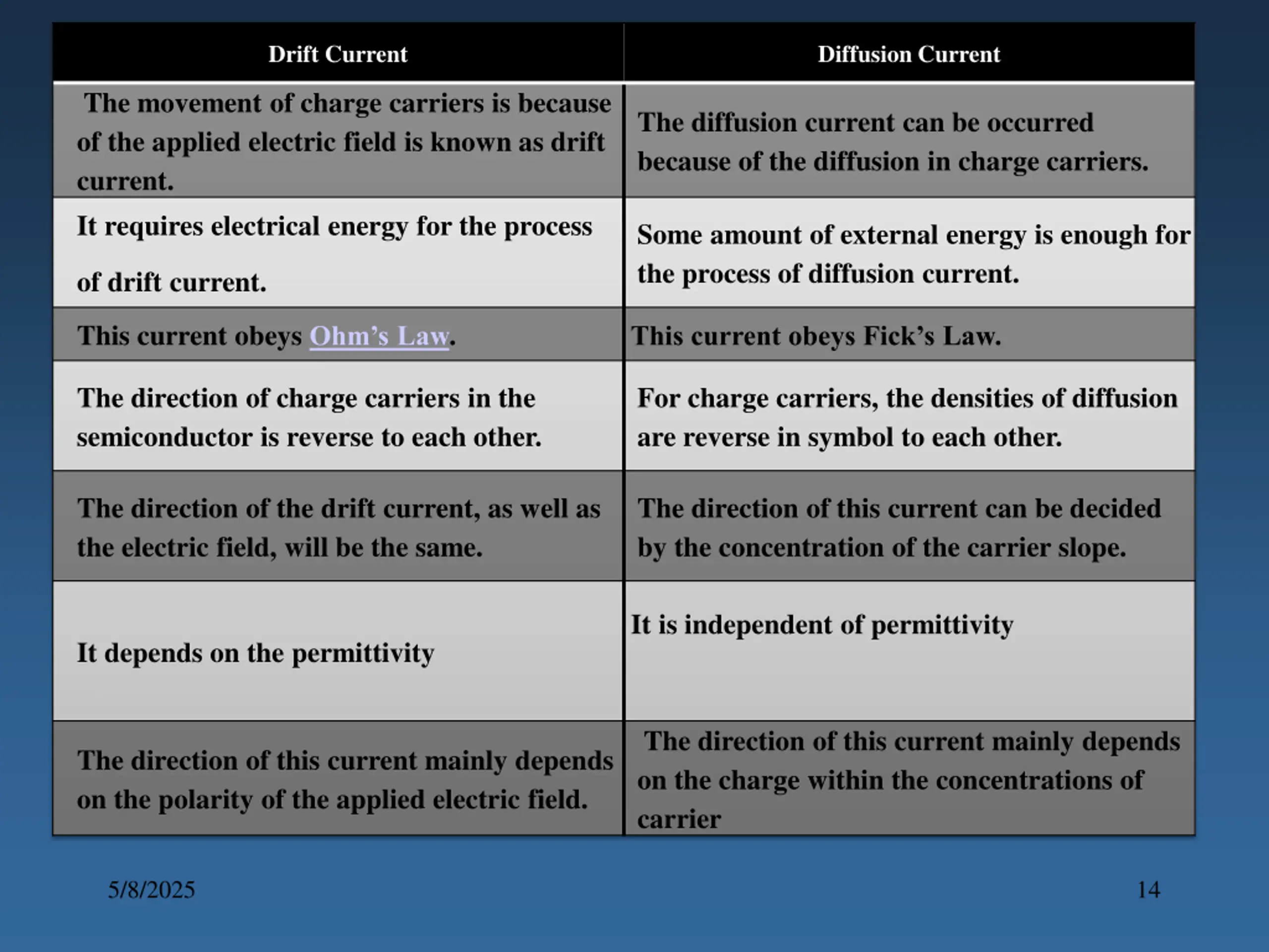 Drift Current Diffusion Current The movement of charge carriers is because of the applied electric field is known as drift current. It requires electrical energy for the process The diffusion current can be occurred because of the diffusion in charge carriers. Some amount of external energy is enough for the process of diffusion current. of drift current. This current obeys Ohm s Law. This current obeys Fick s Law. The direction of charge carriers in the semiconductor is reverse to each other. For charge carriers, the densities of diffusion are reverse in symbol to each other. The direction of the drift current, as well as the electric field, will be the same. The direction of this current can be decided by the concentration of the carrier slope. It is independent of permittivity It depends on the permittivity The direction of this current mainly depends on the charge within the concentrations of carrier The direction of this current mainly depends on the polarity of the applied electric field. 5/8/2025 14