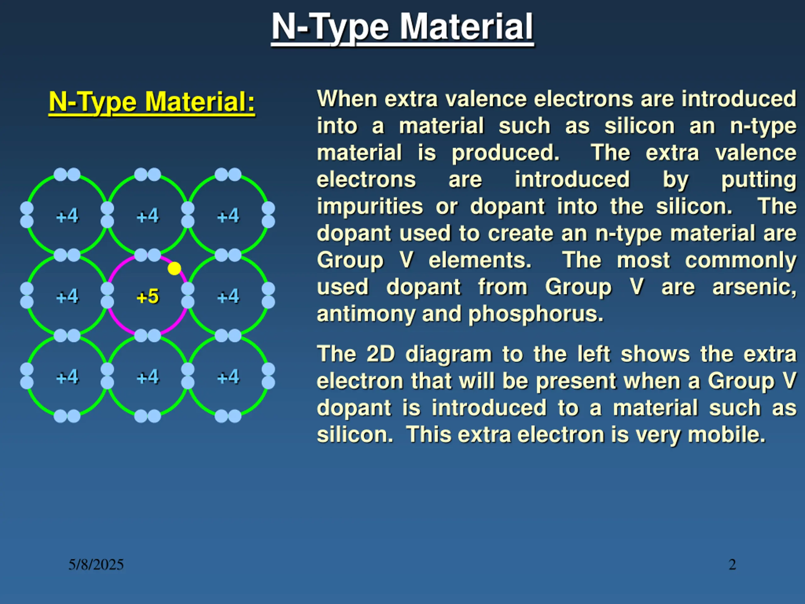 N-Type Material When extra valence electrons are introduced into a material such as silicon an n-type material is produced. The extra valence electrons are introduced impurities or dopant into the silicon. The dopant used to create an n-type material are Group V elements. The most commonly used dopant from Group V are arsenic, antimony and phosphorus. N-Type Material: by putting +4 +4 +4 +4 +5 +4 The 2D diagram to the left shows the extra electron that will be present when a Group V dopant is introduced to a material such as silicon. This extra electron is very mobile. +4 +4 +4 5/8/2025 2