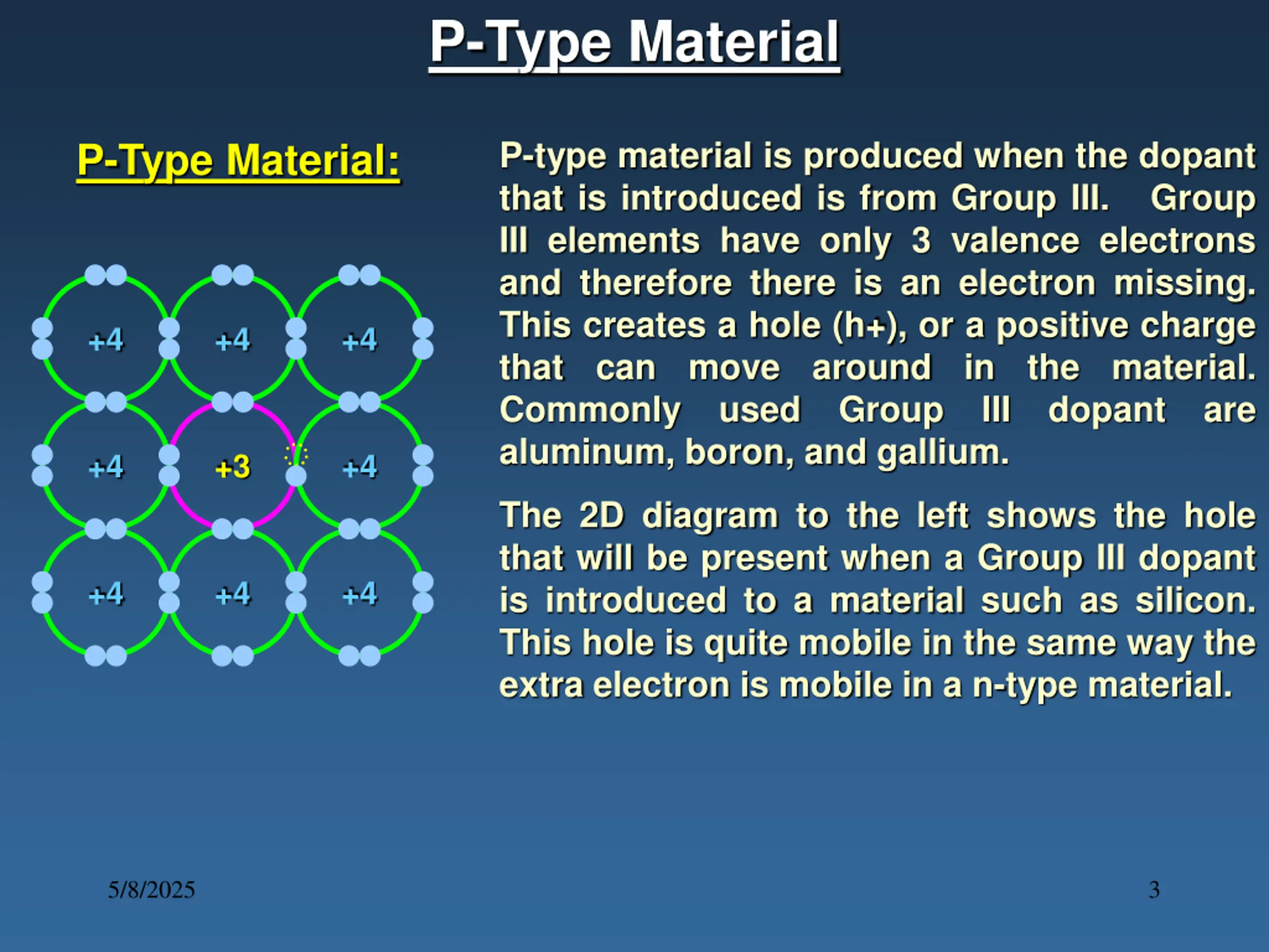 P-Type Material P-type material is produced when the dopant that is introduced is from Group III. Group III elements have only 3 valence electrons and therefore there is an electron missing. This creates a hole (h+), or a positive charge that can move around in the material. Commonly used Group III dopant are aluminum, boron, and gallium. P-Type Material: +4 +4 +4 +4 +3 +4 The 2D diagram to the left shows the hole that will be present when a Group III dopant is introduced to a material such as silicon. This hole is quite mobile in the same way the extra electron is mobile in a n-type material. +4 +4 +4 5/8/2025 3