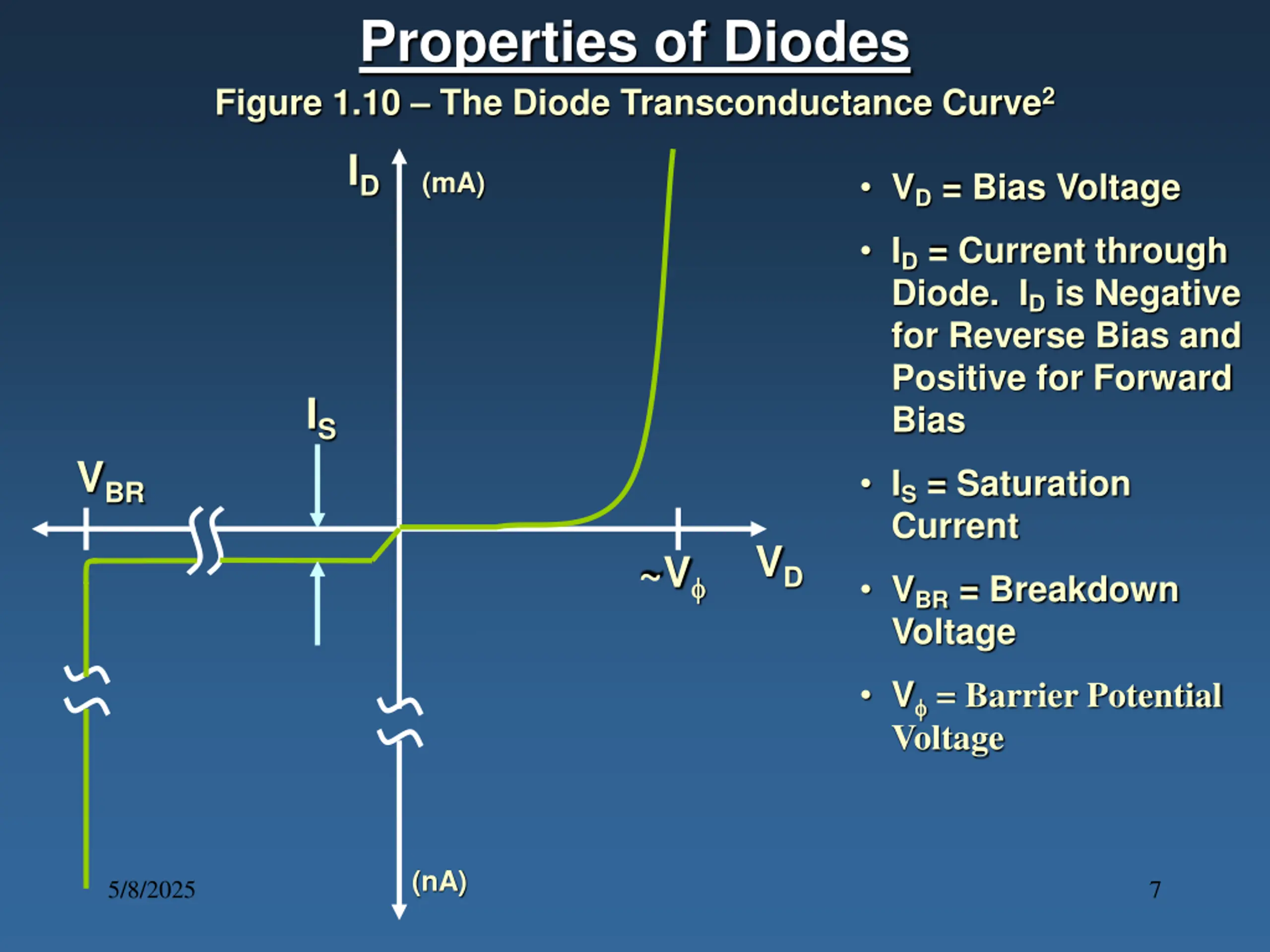 Properties of Diodes Figure 1.10 The Diode Transconductance Curve2 ID VD = Bias Voltage (mA) ID = Current through Diode. ID is Negative for Reverse Bias and Positive for Forward Bias IS VBR IS = Saturation Current VD ~V VBR = Breakdown Voltage V = Barrier Potential Voltage (nA) 5/8/2025 7