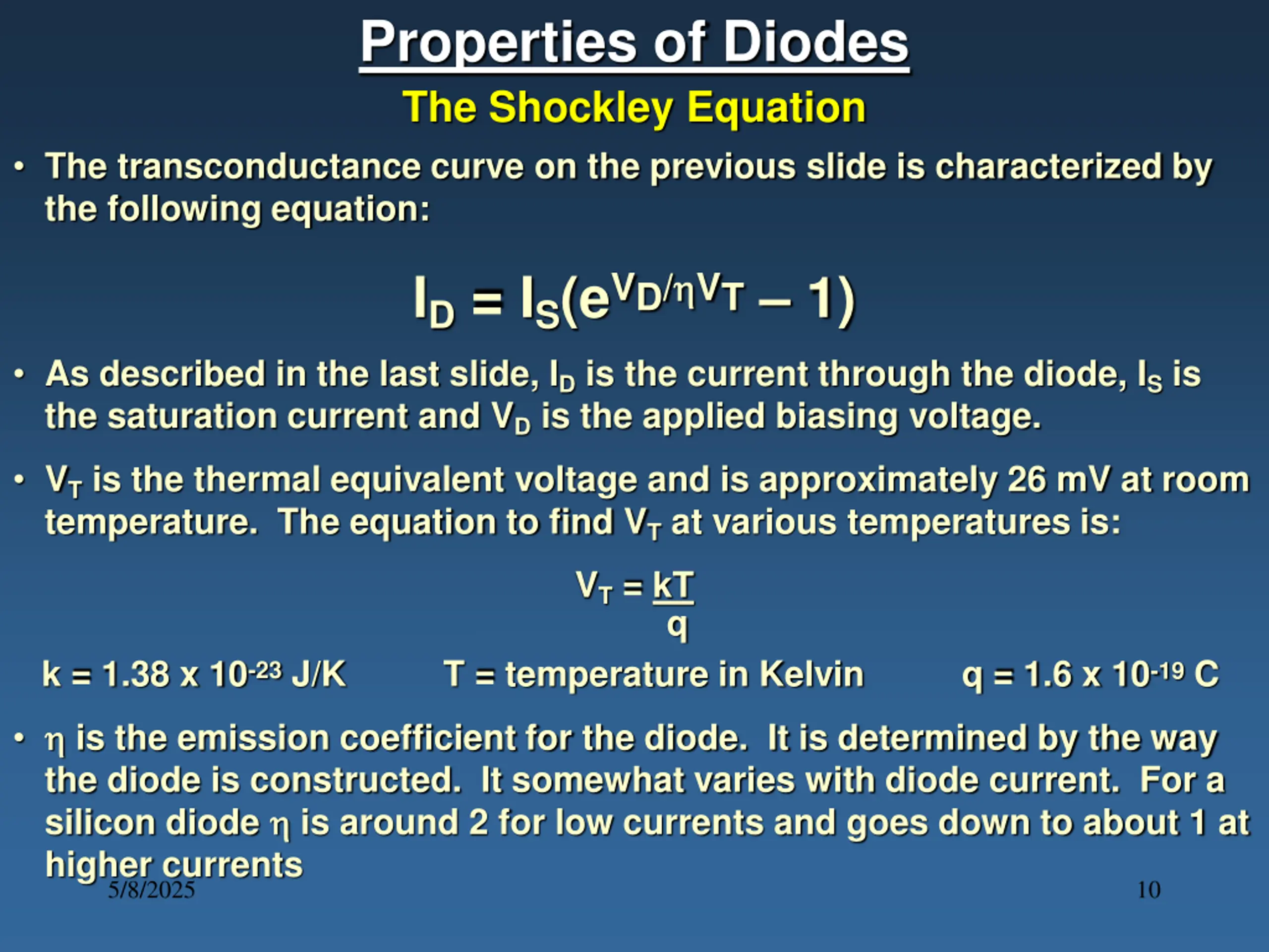 Properties of Diodes The Shockley Equation The transconductance curve on the previous slide is characterized by the following equation: ID = IS(eVD/ VT 1) As described in the last slide, ID is the current through the diode, IS is the saturation current and VD is the applied biasing voltage. VT is the thermal equivalent voltage and is approximately 26 mV at room temperature. The equation to find VT at various temperatures is: VT = kT k = 1.38 x 10-23 J/K T = temperature in Kelvin q = 1.6 x 10-19 C q is the emission coefficient for the diode. It is determined by the way the diode is constructed. It somewhat varies with diode current. For a silicon diode is around 2 for low currents and goes down to about 1 at higher currents 5/8/2025 10