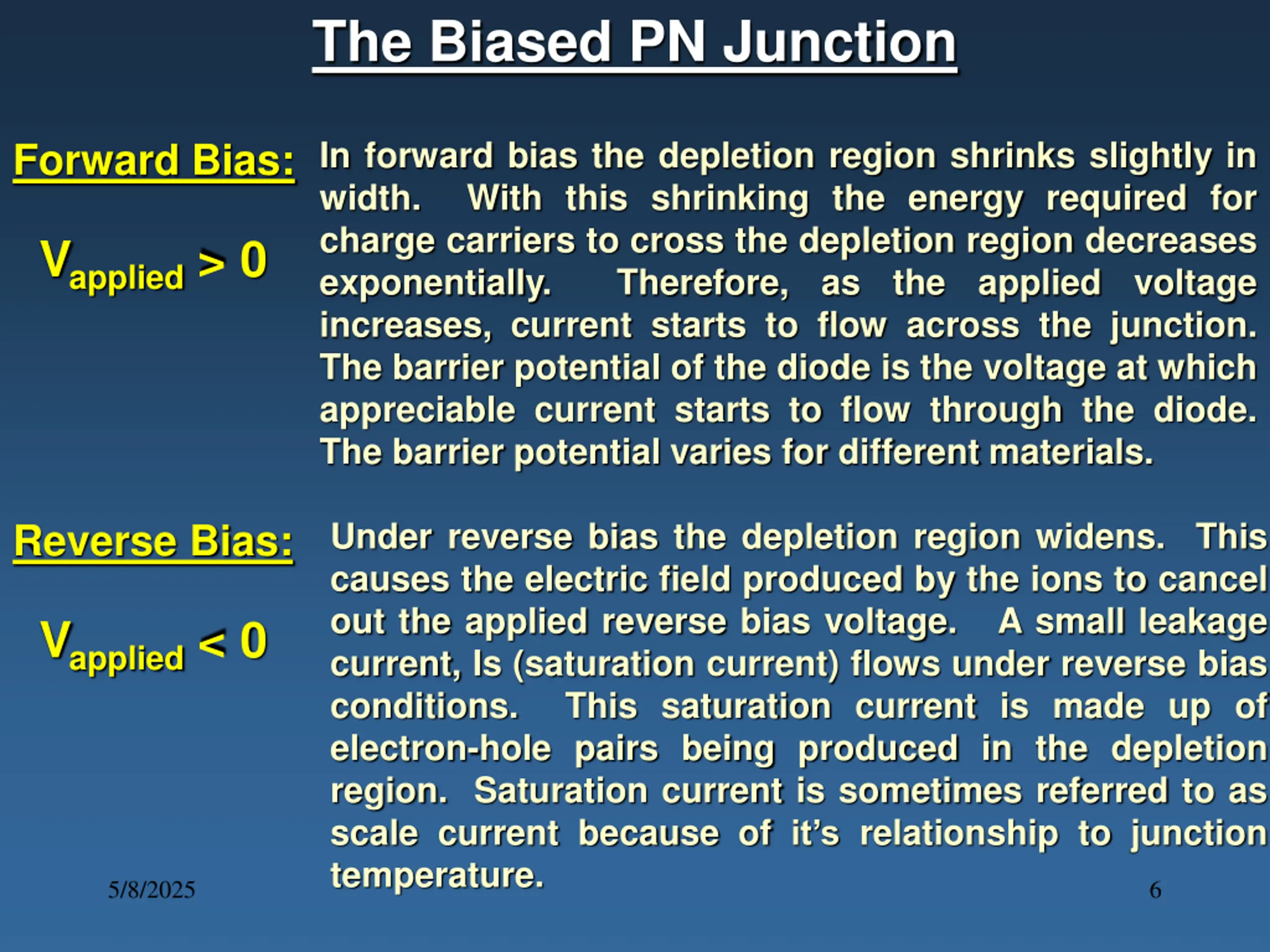 The Biased PN Junction Forward Bias: In forward bias the depletion region shrinks slightly in width. With this shrinking the energy required for charge carriers to cross the depletion region decreases exponentially. Therefore, as the applied voltage increases, current starts to flow across the junction. The barrier potential of the diode is the voltage at which appreciable current starts to flow through the diode. The barrier potential varies for different materials. Vapplied > 0 Under reverse bias the depletion region widens. This causes the electric field produced by the ions to cancel out the applied reverse bias voltage. A small leakage current, Is (saturation current) flows under reverse bias conditions. This saturation current is made up of electron-hole pairs being produced in the depletion region. Saturation current is sometimes referred to as scale current because of it s relationship to junction temperature. Reverse Bias: Vapplied < 0 5/8/2025 6
