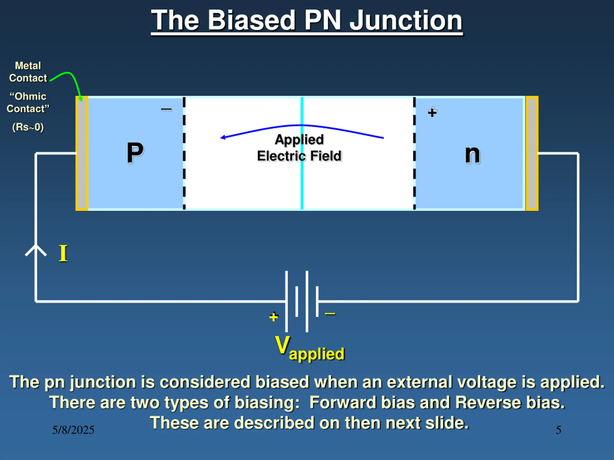 The Biased PN Junction Metal Contact _ Ohmic Contact + (Rs~0) Applied Electric Field P n I _ + Vapplied The pn junction is considered biased when an external voltage is applied. There are two types of biasing: Forward bias and Reverse bias. These are described on then next slide. 5/8/2025 5