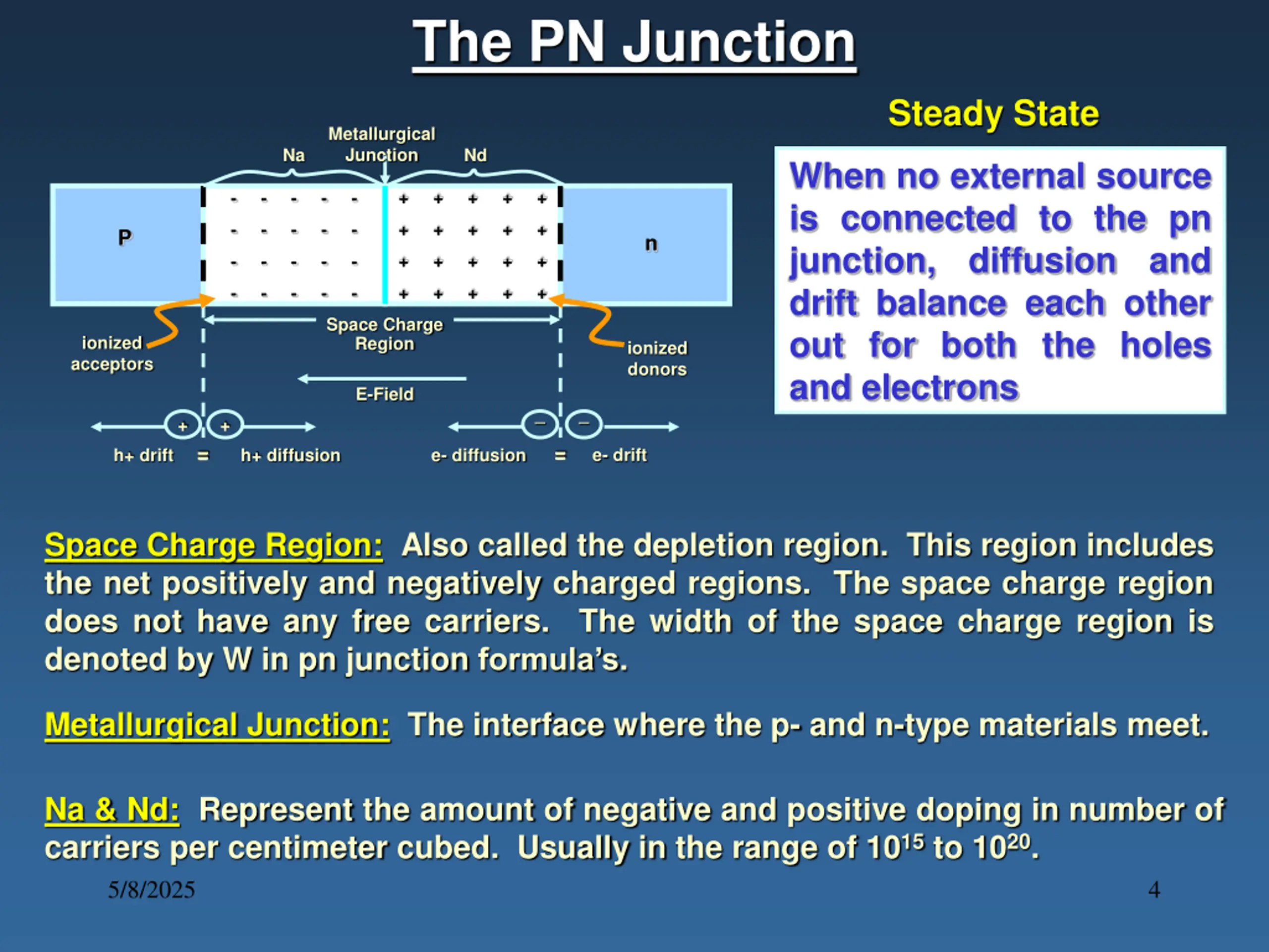 The PN Junction Steady State Metallurgical Junction Na Nd When no external source is connected to the pn junction, diffusion and drift balance each other out for both the holes and electrons + + + + + - - - - - + + + + + - - - - - P n + + + + + - - - - - + + + + + - - - - - Space Charge Region ionized acceptors ionized donors E-Field _ _ + + = = = = e- drift h+ drift h+ diffusion e- diffusion Space Charge Region: Also called the depletion region. This region includes the net positively and negatively charged regions. The space charge region does not have any free carriers. The width of the space charge region is denoted by W in pn junction formula s. Metallurgical Junction: The interface where the p- and n-type materials meet. Na & Nd: Represent the amount of negative and positive doping in number of carriers per centimeter cubed. Usually in the range of 1015 to 1020. 5/8/2025 4