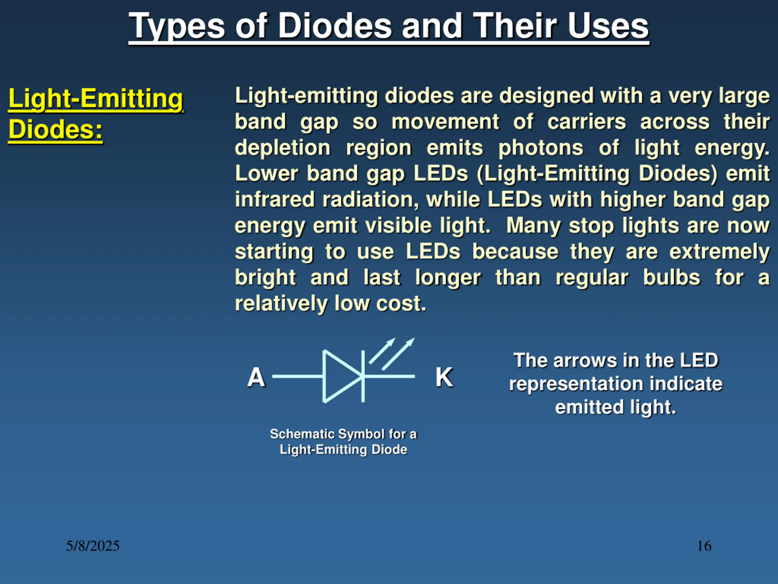 Types of Diodes and Their Uses Light-emitting diodes are designed with a very large band gap so movement of carriers across their depletion region emits photons of light energy. Lower band gap LEDs (Light-Emitting Diodes) emit infrared radiation, while LEDs with higher band gap energy emit visible light. Many stop lights are now starting to use LEDs because they are extremely bright and last longer than regular bulbs for a relatively low cost. Light-Emitting Diodes: The arrows in the LED representation indicate emitted light. A K Schematic Symbol for a Light-Emitting Diode 5/8/2025 16