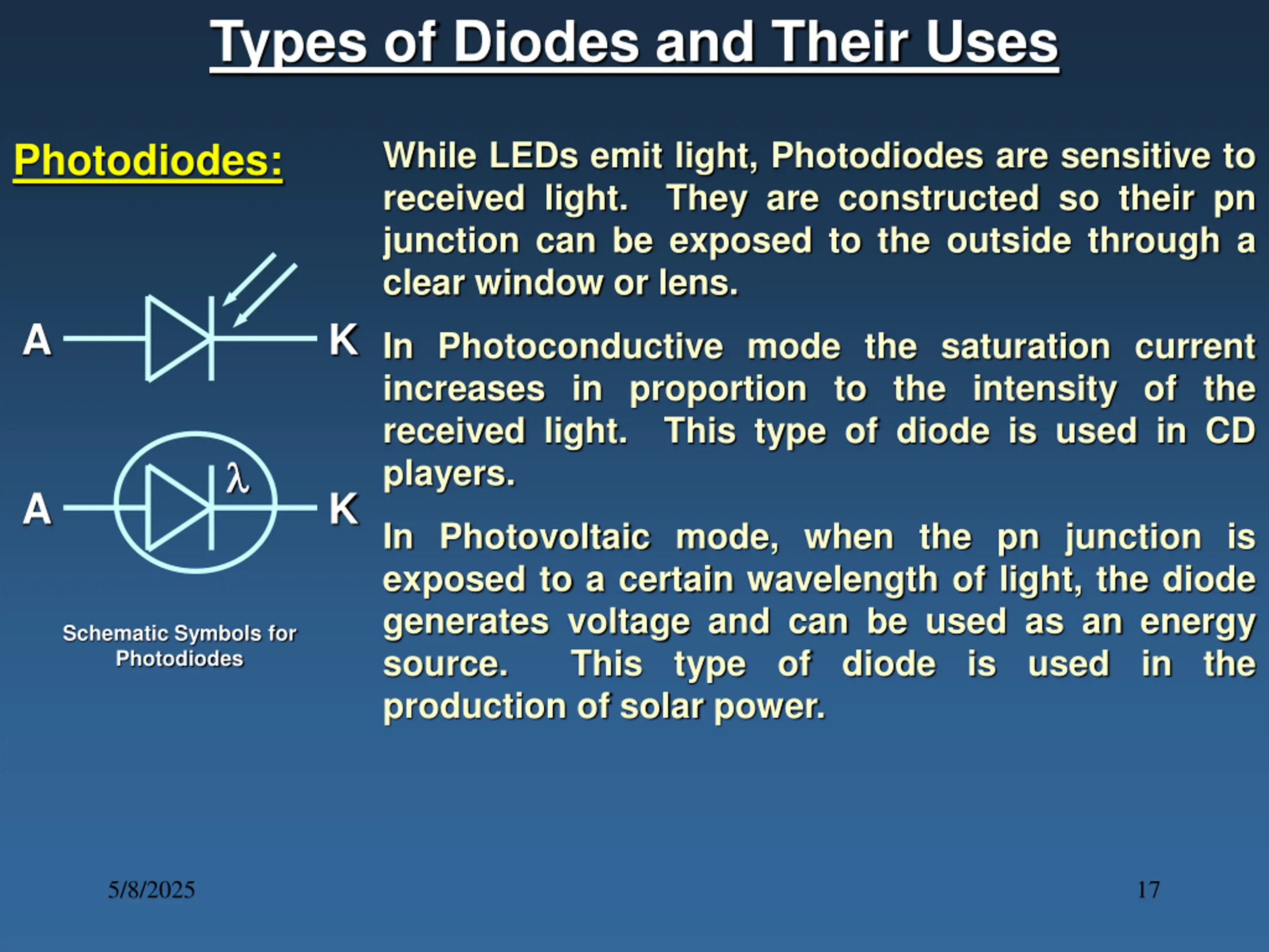 Types of Diodes and Their Uses While LEDs emit light, Photodiodes are sensitive to received light. They are constructed so their pn junction can be exposed to the outside through a clear window or lens. Photodiodes: A K In Photoconductive mode the saturation current increases in proportion to the intensity of the received light. This type of diode is used in CD players. A K In Photovoltaic mode, when the pn junction is exposed to a certain wavelength of light, the diode generates voltage and can be used as an energy source. This type of diode is used in the production of solar power. Schematic Symbols for Photodiodes 5/8/2025 17