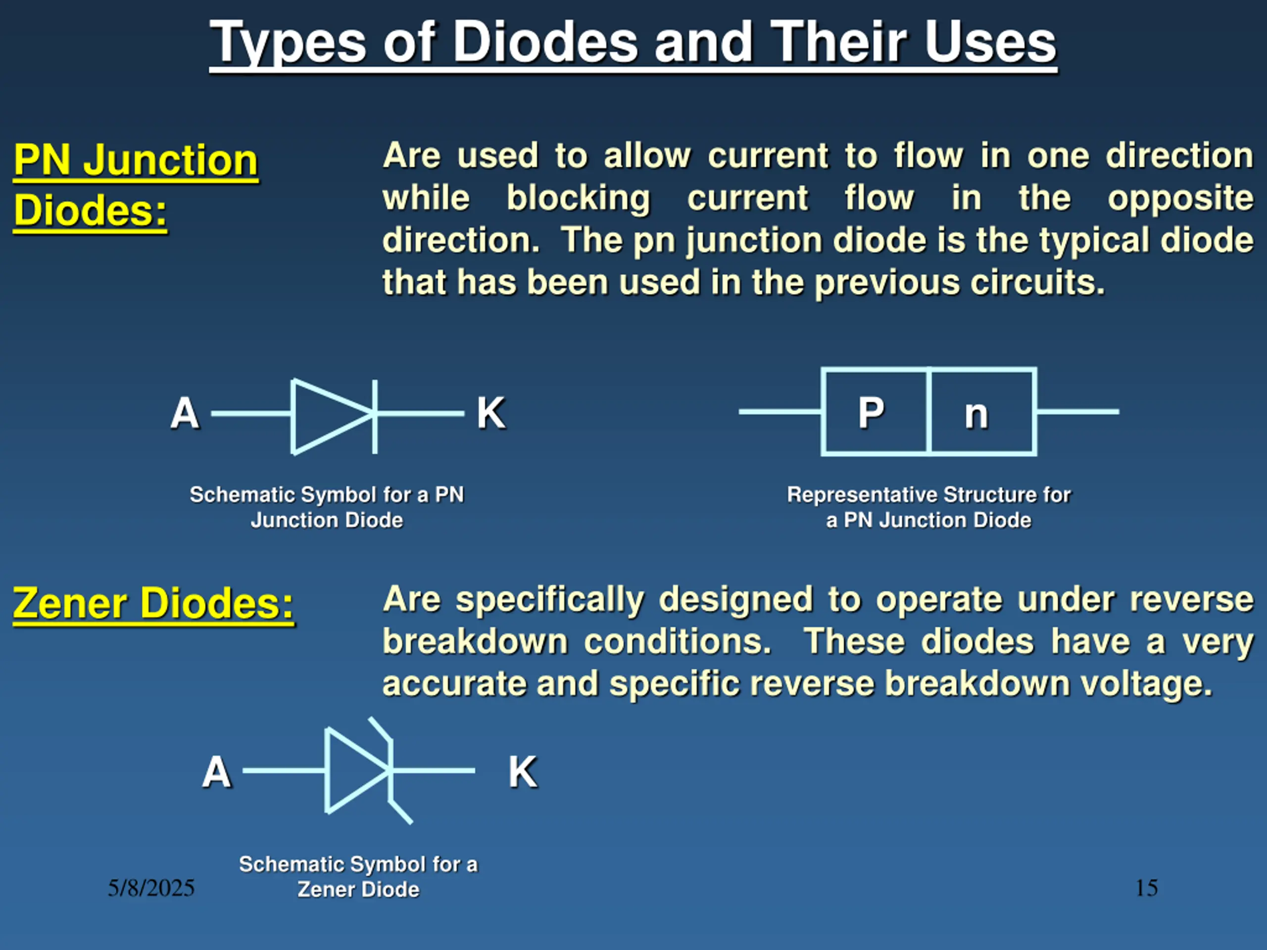 Types of Diodes and Their Uses Are used to allow current to flow in one direction while blocking current flow in the opposite direction. The pn junction diode is the typical diode that has been used in the previous circuits. PN Junction Diodes: A K P n Schematic Symbol for a PN Junction Diode Representative Structure for a PN Junction Diode Are specifically designed to operate under reverse breakdown conditions. These diodes have a very accurate and specific reverse breakdown voltage. Zener Diodes: A K Schematic Symbol for a Zener Diode 5/8/2025 15