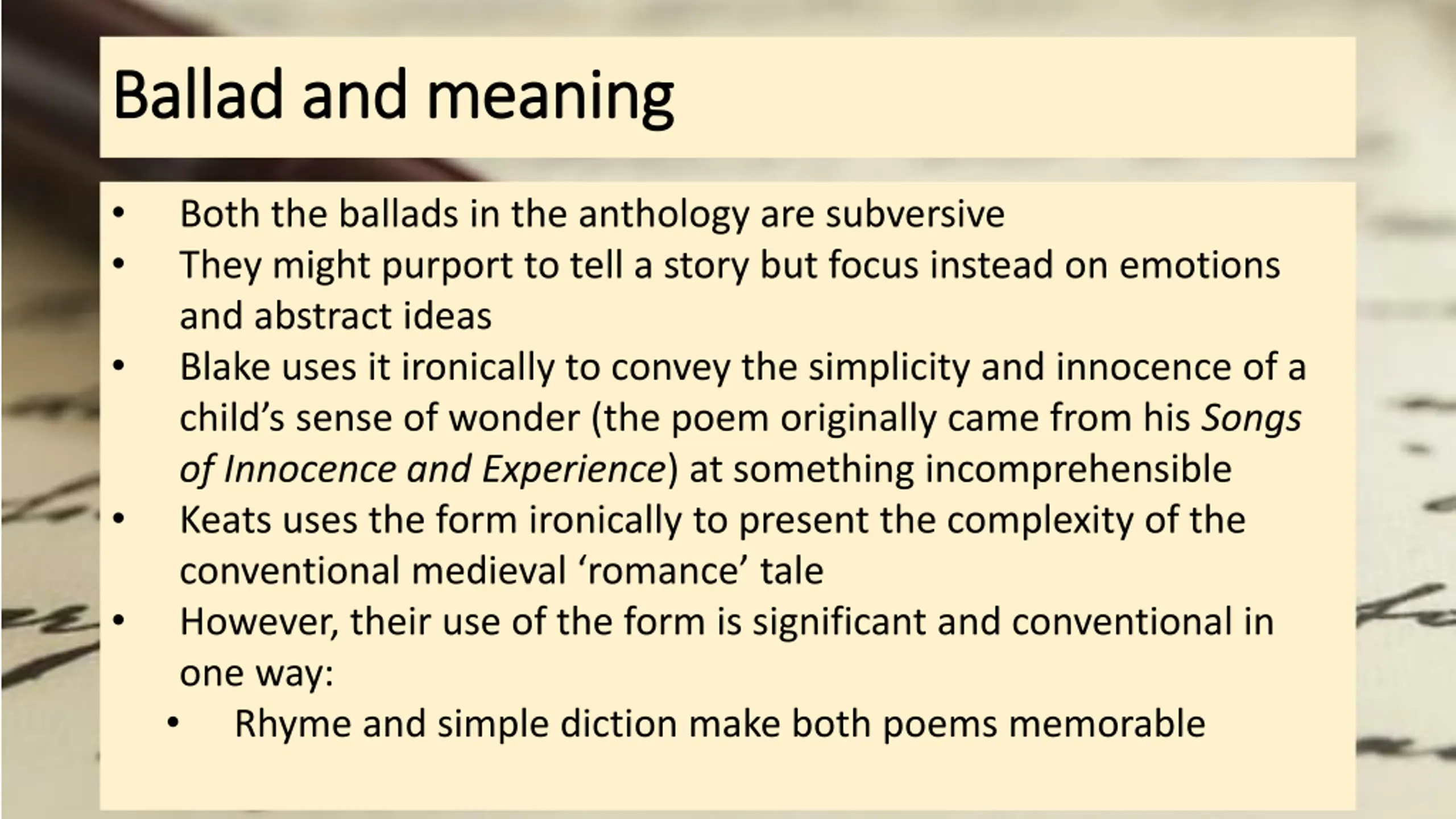 Ballad and meaning Ballad and meaning Both the ballads in the anthology are subversive They might purport to tell a story but focus instead on emotions and abstract ideas Blake uses it ironically to convey the simplicity and innocence of a child s sense of wonder (the poem originally came from his Songs of Innocence and Experience) at something incomprehensible Keats uses the form ironically to present the complexity of the conventional medieval romance tale However, their use of the form is significant and conventional in one way: Rhyme and simple diction make both poems memorable