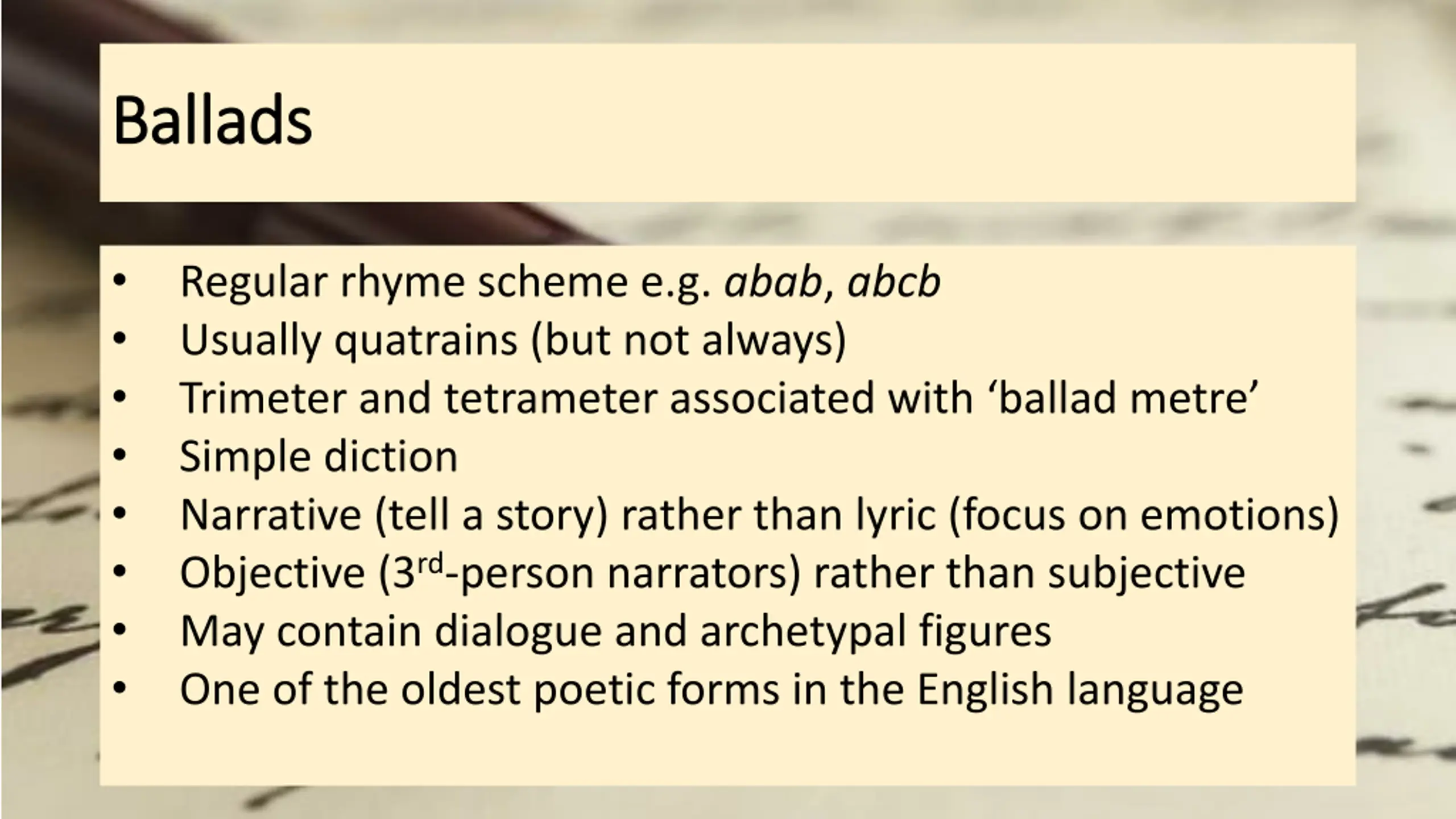 Ballads Ballads Regular rhyme scheme e.g. abab, abcb Usually quatrains (but not always) Trimeter and tetrameter associated with ballad metre Simple diction Narrative (tell a story) rather than lyric (focus on emotions) Objective (3rd-person narrators) rather than subjective May contain dialogue and archetypal figures One of the oldest poetic forms in the English language