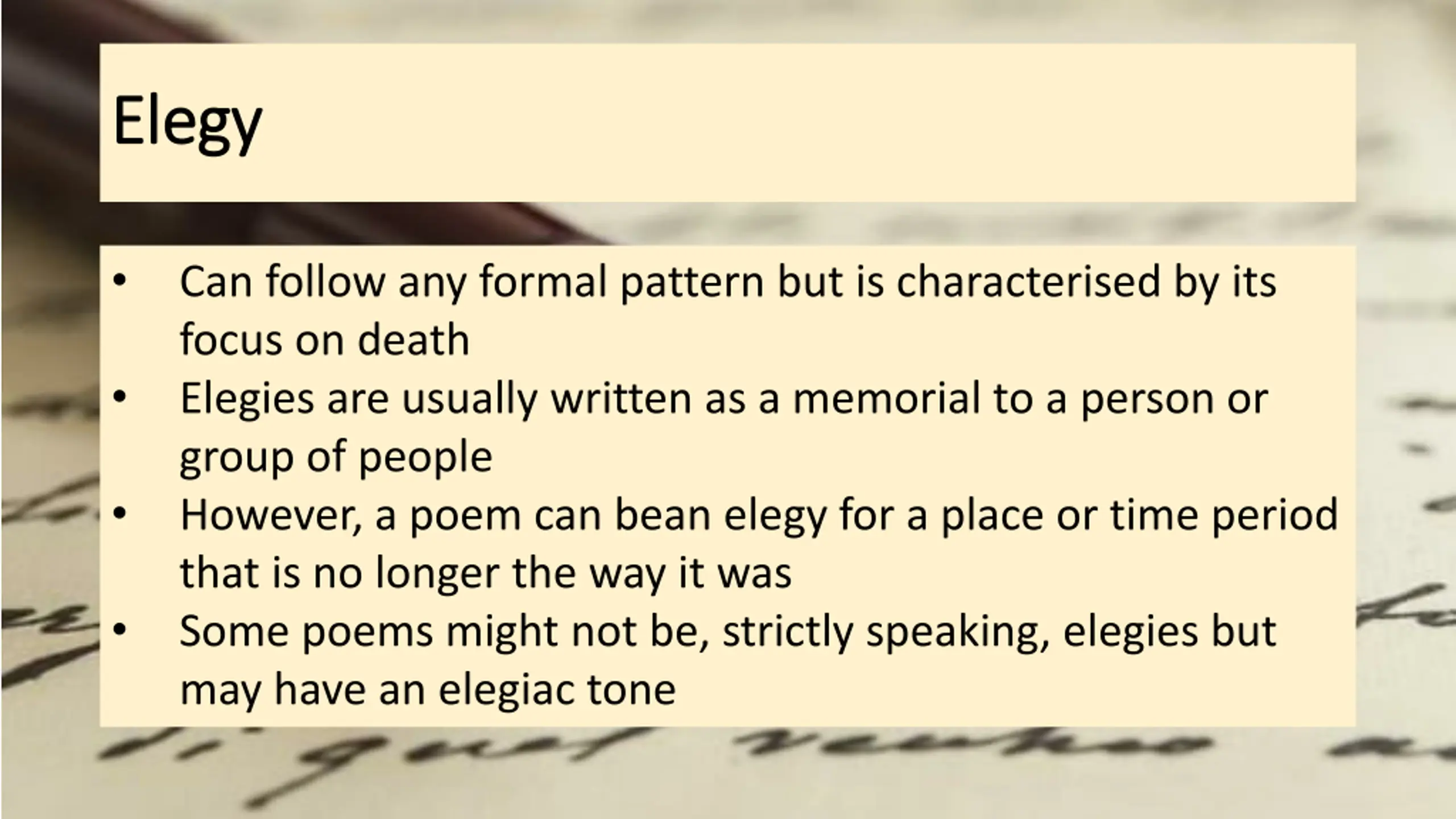 Elegy Elegy Can follow any formal pattern but is characterised by its focus on death Elegies are usually written as a memorial to a person or group of people However, a poem can bean elegy for a place or time period that is no longer the way it was Some poems might not be, strictly speaking, elegies but may have an elegiac tone
