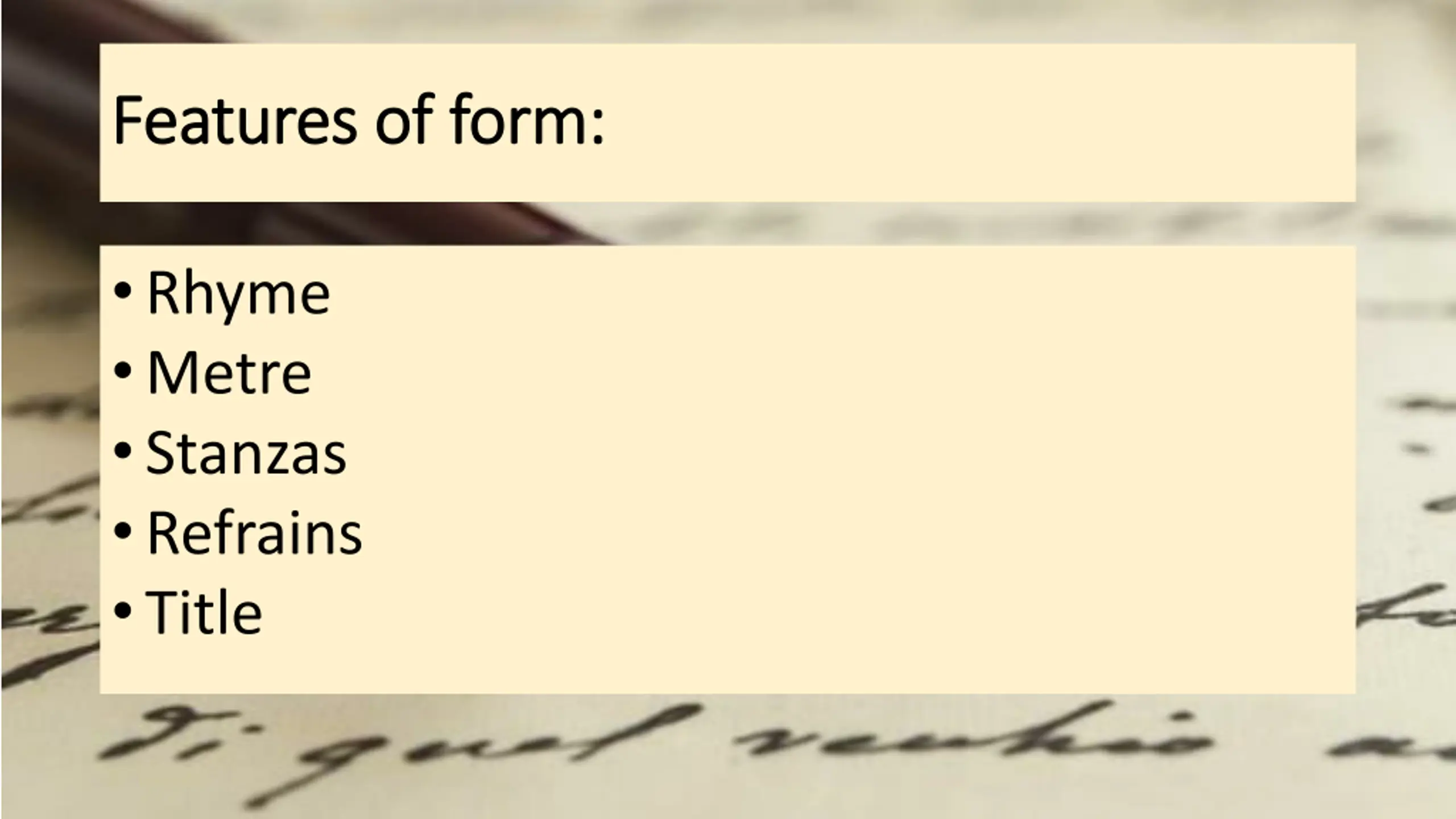 Features of form: Features of form: Rhyme Metre Stanzas Refrains Title