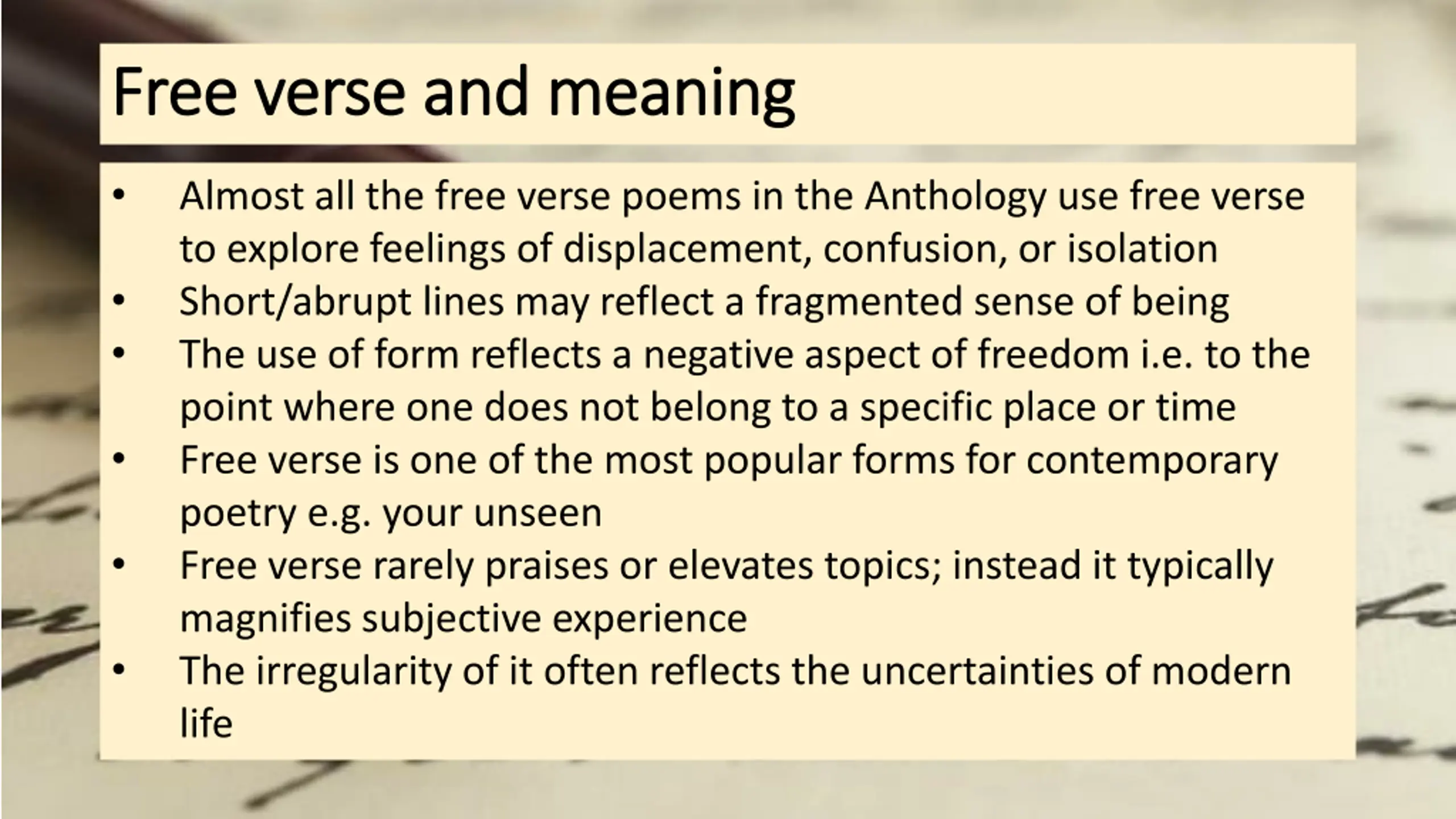 Free verse and meaning Free verse and meaning Almost all the free verse poems in the Anthology use free verse to explore feelings of displacement, confusion, or isolation Short/abrupt lines may reflect a fragmented sense of being The use of form reflects a negative aspect of freedom i.e. to the point where one does not belong to a specific place or time Free verse is one of the most popular forms for contemporary poetry e.g. your unseen Free verse rarely praises or elevates topics; instead it typically magnifies subjective experience The irregularity of it often reflects the uncertainties of modern life