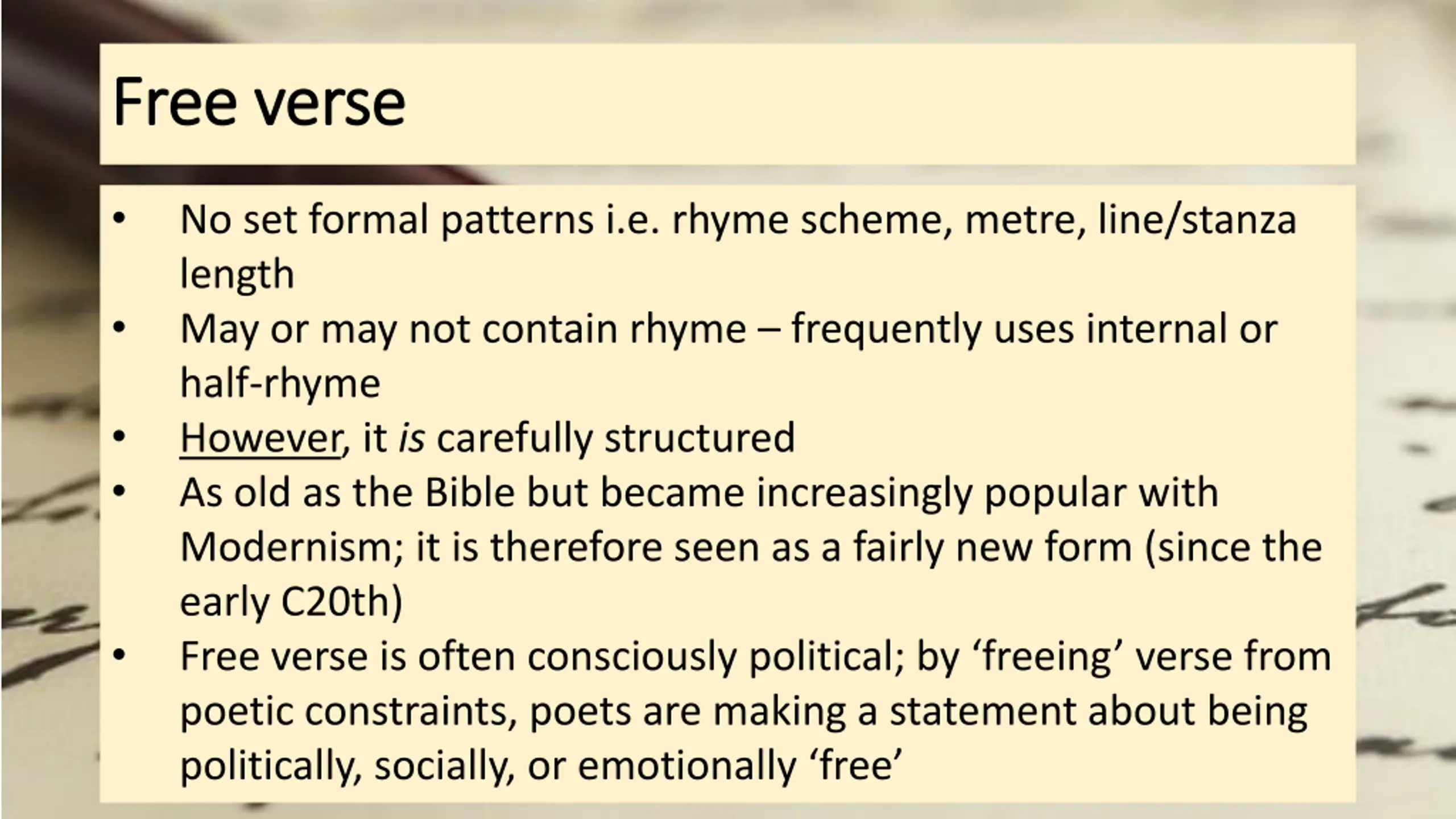 Free verse Free verse No set formal patterns i.e. rhyme scheme, metre, line/stanza length May or may not contain rhyme frequently uses internal or half-rhyme However, it is carefully structured As old as the Bible but became increasingly popular with Modernism; it is therefore seen as a fairly new form (since the early C20th) Free verse is often consciously political; by freeing verse from poetic constraints, poets are making a statement about being politically, socially, or emotionally free