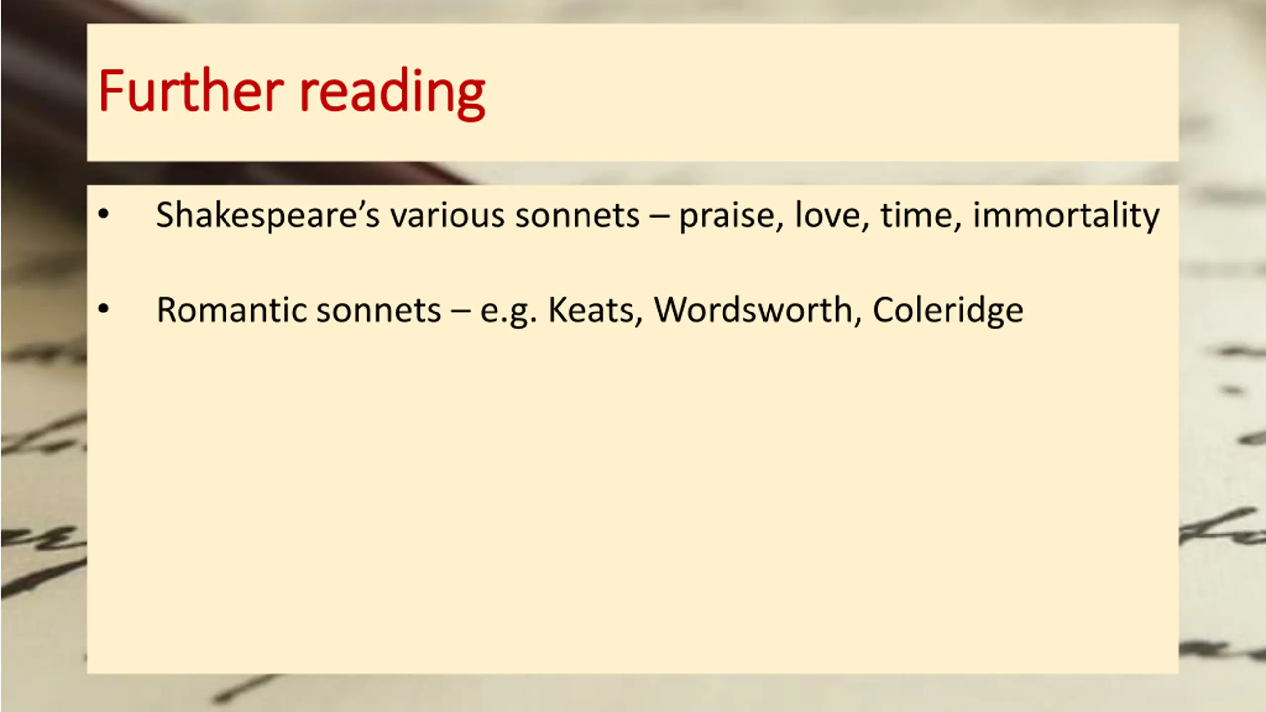 Further reading Further reading Shakespeare s various sonnets praise, love, time, immortality Romantic sonnets e.g. Keats, Wordsworth, Coleridge