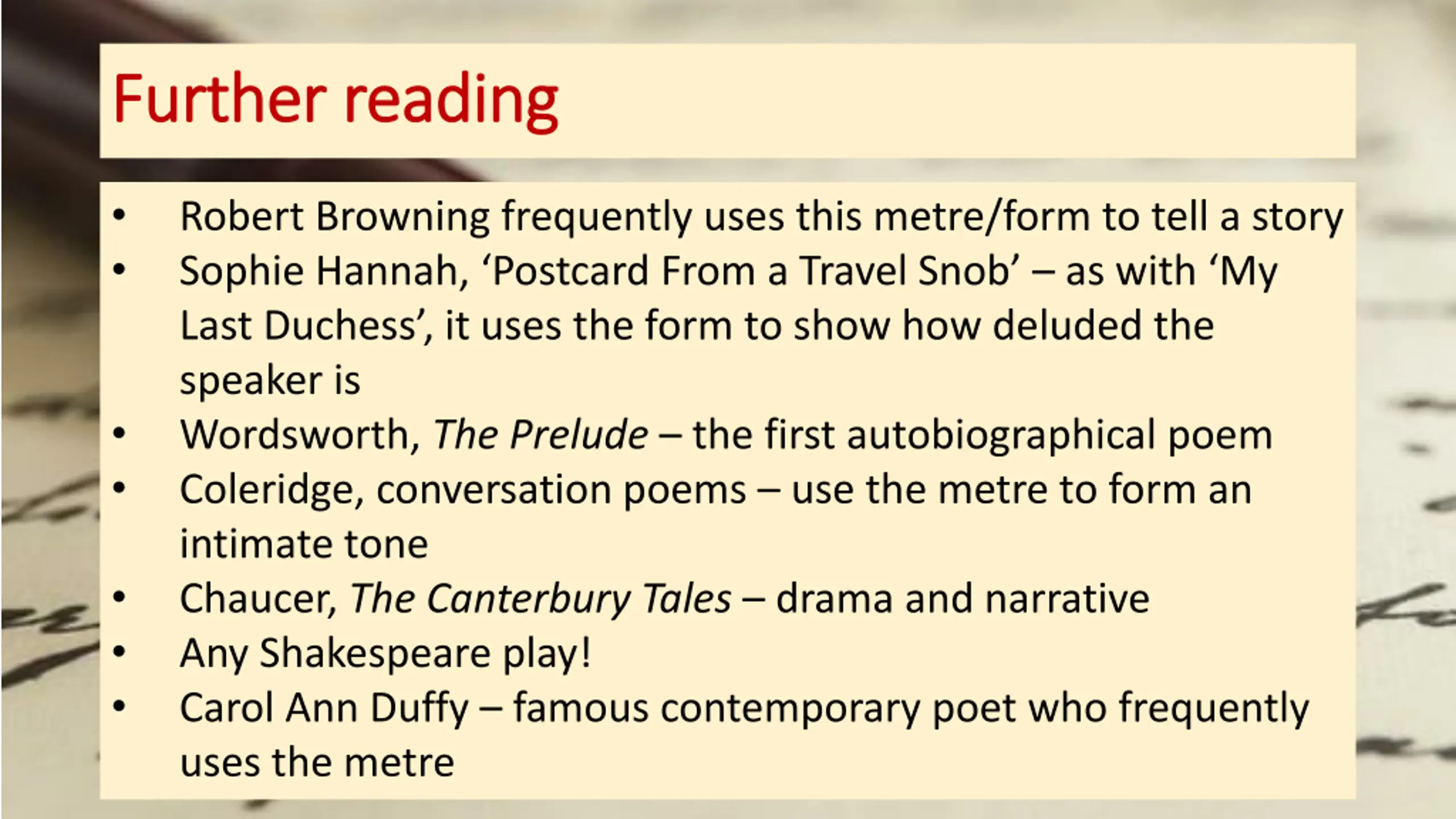 Further reading Further reading Robert Browning frequently uses this metre/form to tell a story Sophie Hannah, Postcard From a Travel Snob as with My Last Duchess , it uses the form to show how deluded the speaker is Wordsworth, The Prelude the first autobiographical poem Coleridge, conversation poems use the metre to form an intimate tone Chaucer, The Canterbury Tales drama and narrative Any Shakespeare play! Carol Ann Duffy famous contemporary poet who frequently uses the metre