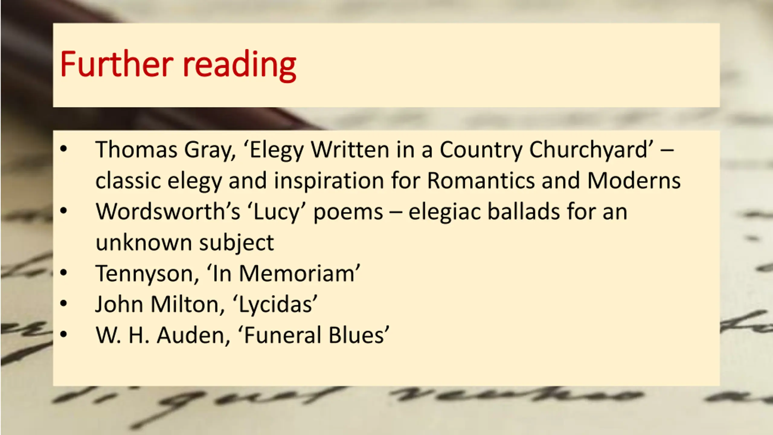 Further reading Further reading Thomas Gray, Elegy Written in a Country Churchyard classic elegy and inspiration for Romantics and Moderns Wordsworth s Lucy poems elegiac ballads for an unknown subject Tennyson, In Memoriam John Milton, Lycidas W. H. Auden, Funeral Blues