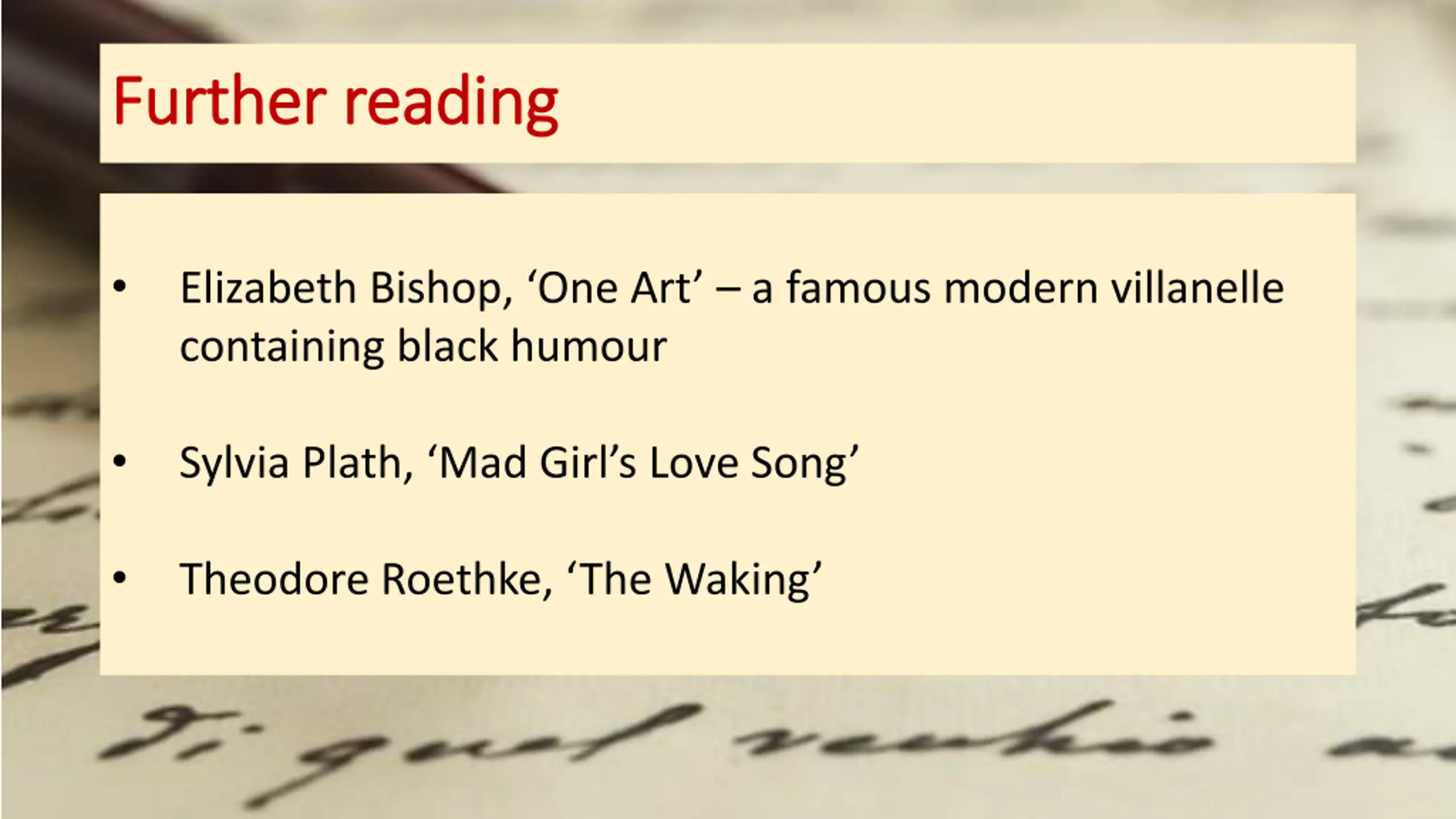 Further reading Further reading Elizabeth Bishop, One Art a famous modern villanelle containing black humour Sylvia Plath, Mad Girl s Love Song Theodore Roethke, The Waking