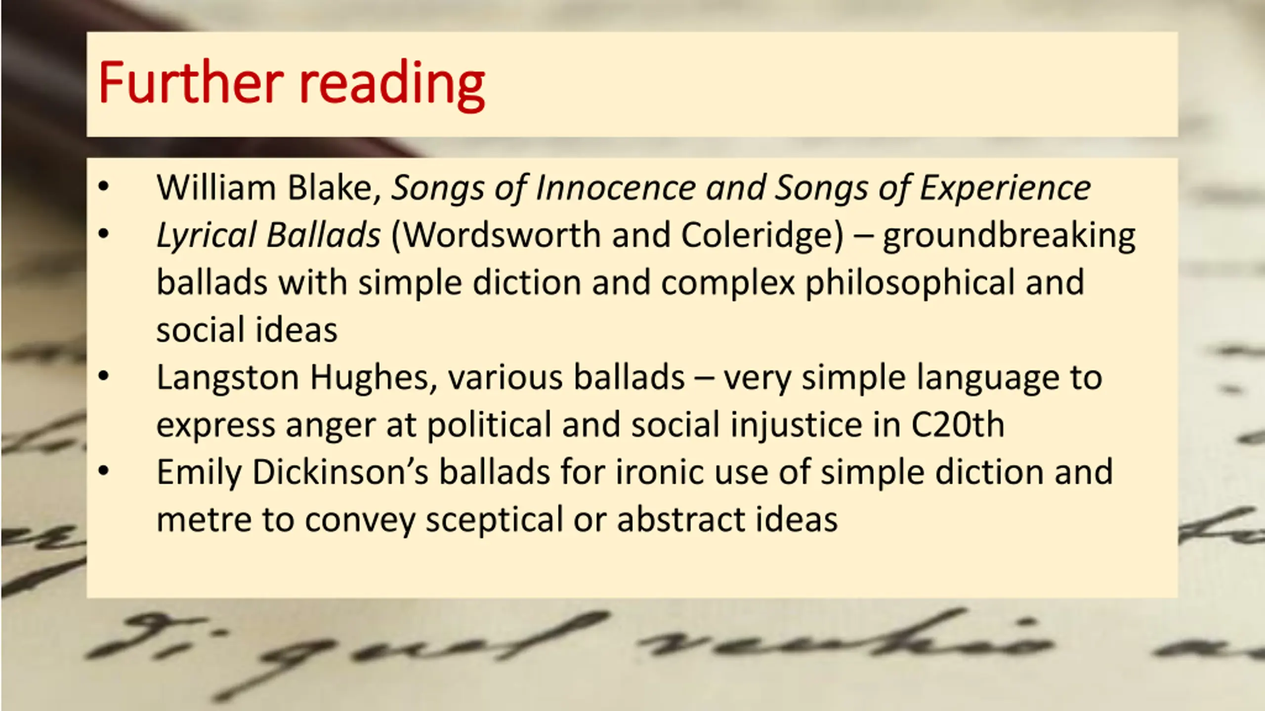 Further reading Further reading William Blake, Songs of Innocence and Songs of Experience Lyrical Ballads (Wordsworth and Coleridge) groundbreaking ballads with simple diction and complex philosophical and social ideas Langston Hughes, various ballads very simple language to express anger at political and social injustice in C20th Emily Dickinson s ballads for ironic use of simple diction and metre to convey sceptical or abstract ideas