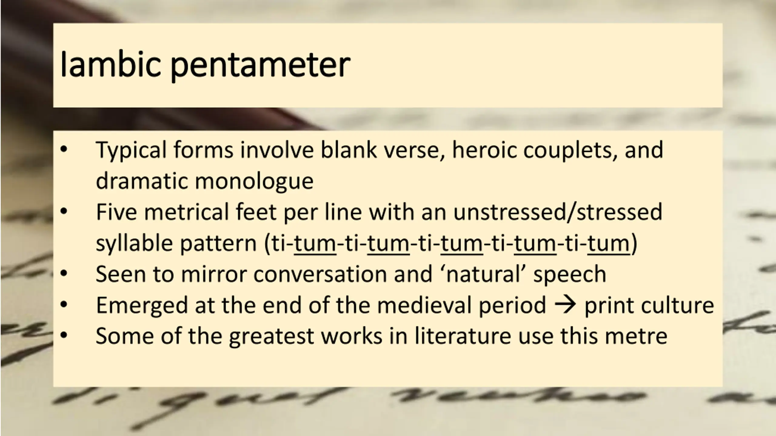 Iambic pentameter Iambic pentameter Typical forms involve blank verse, heroic couplets, and dramatic monologue Five metrical feet per line with an unstressed/stressed syllable pattern (ti-tum-ti-tum-ti-tum-ti-tum-ti-tum) Seen to mirror conversation and natural speech Emerged at the end of the medieval period print culture Some of the greatest works in literature use this metre