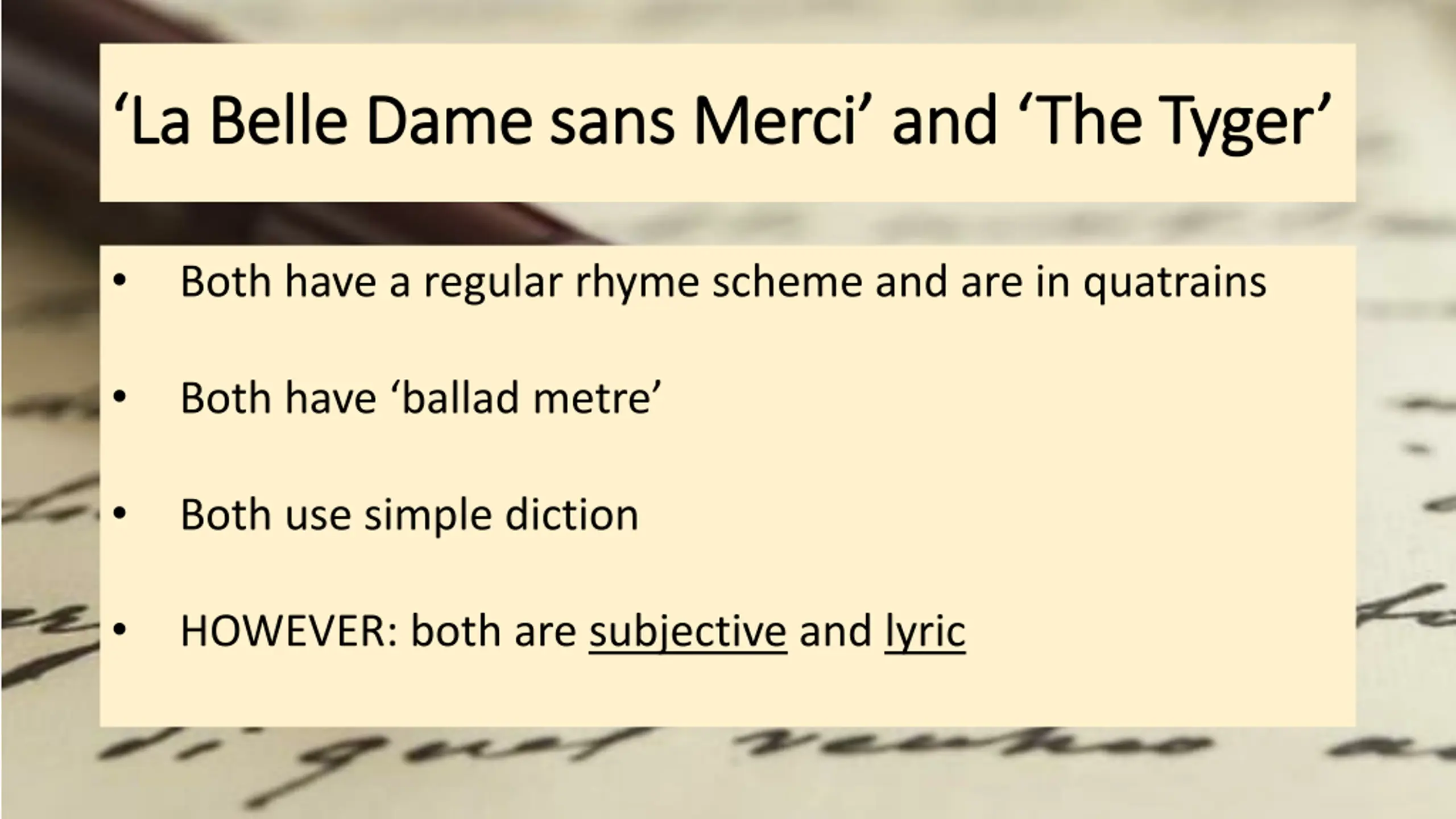 La Belle Dame sans Merci and The Tyger La Belle Dame sans Merci and The Tyger Both have a regular rhyme scheme and are in quatrains Both have ballad metre Both use simple diction HOWEVER: both are subjective and lyric