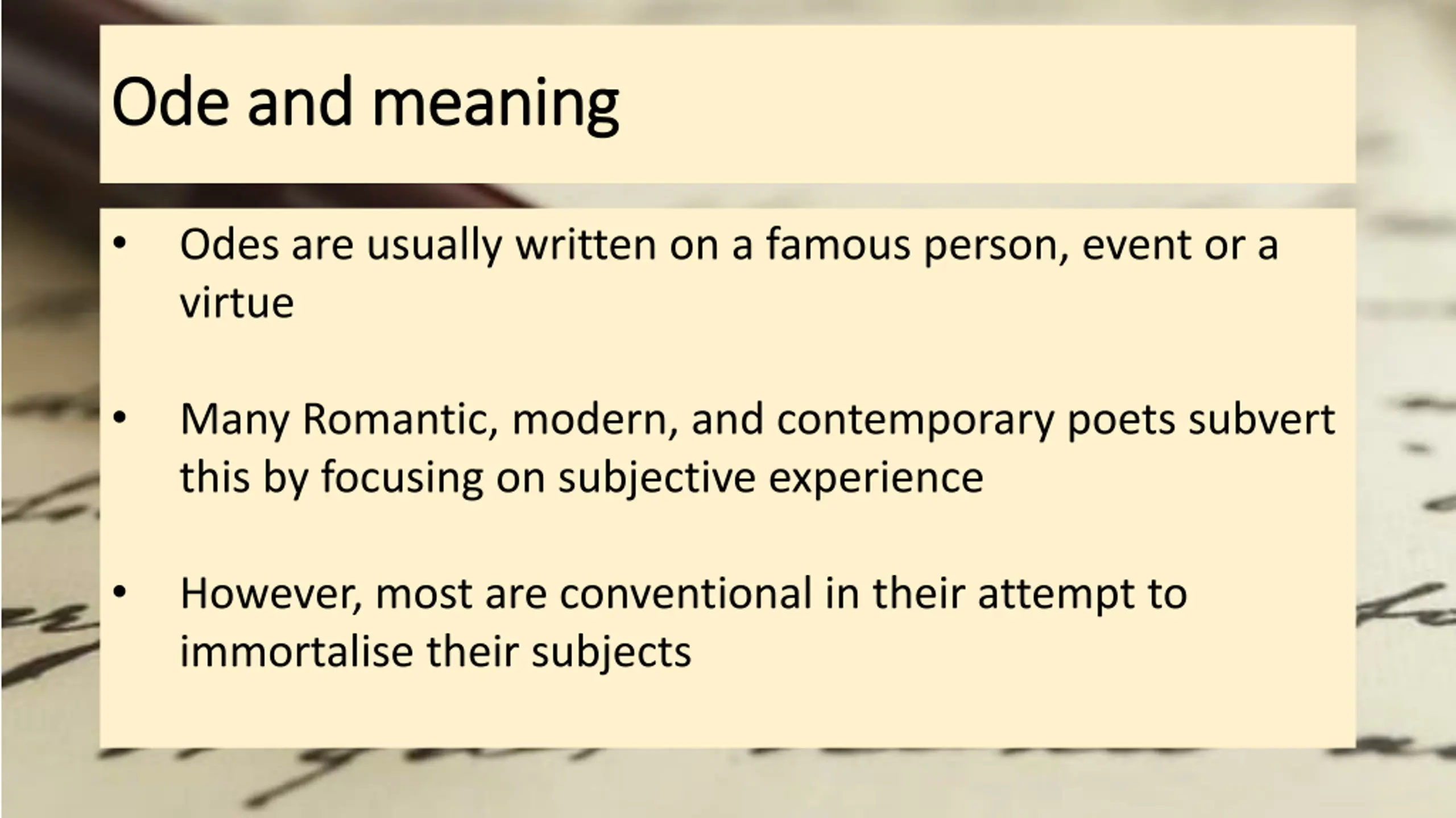 Ode and meaning Ode and meaning Odes are usually written on a famous person, event or a virtue Many Romantic, modern, and contemporary poets subvert this by focusing on subjective experience However, most are conventional in their attempt to immortalise their subjects