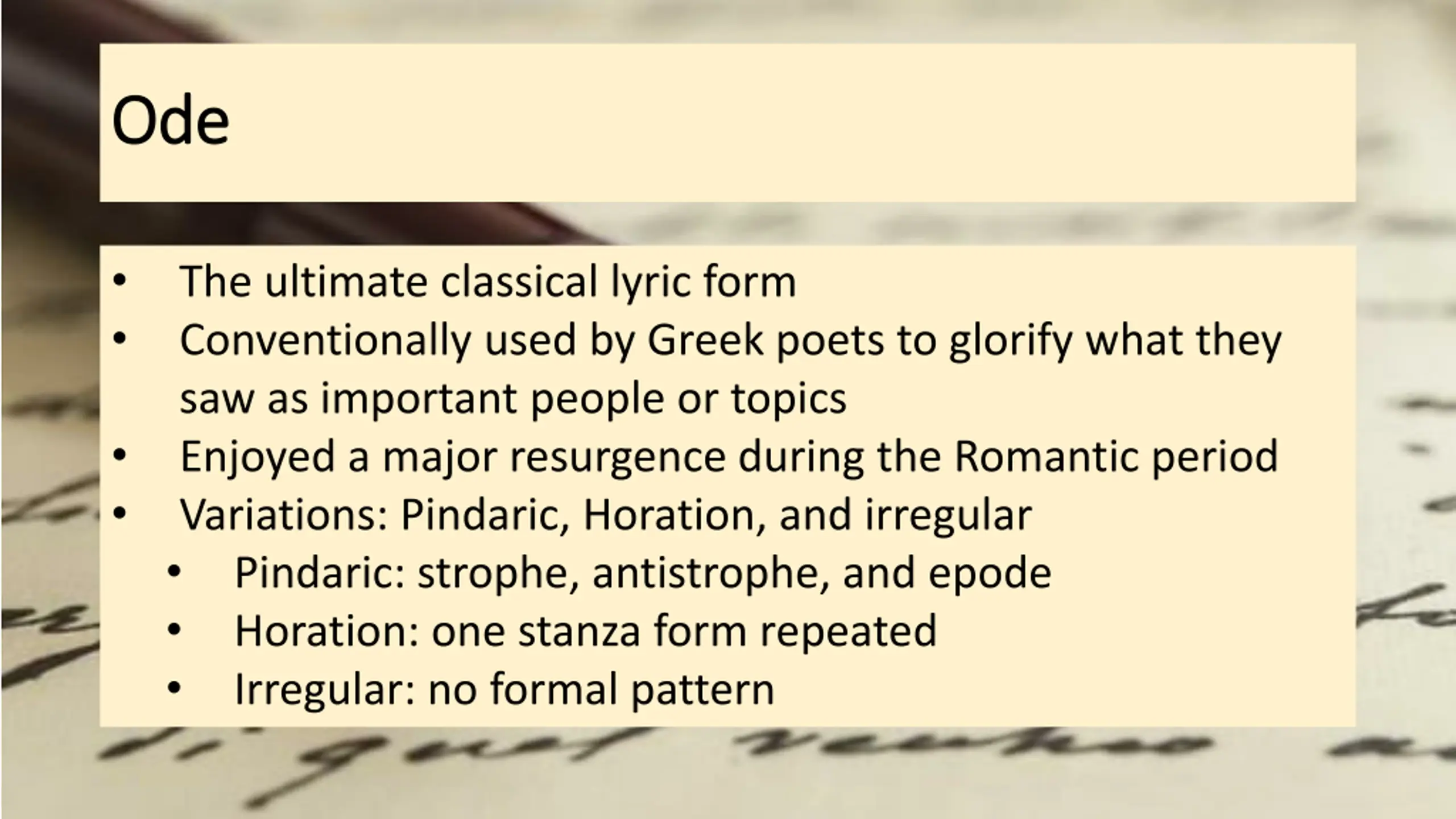 Ode Ode The ultimate classical lyric form Conventionally used by Greek poets to glorify what they saw as important people or topics Enjoyed a major resurgence during the Romantic period Variations: Pindaric, Horation, and irregular Pindaric: strophe, antistrophe, and epode Horation: one stanza form repeated Irregular: no formal pattern