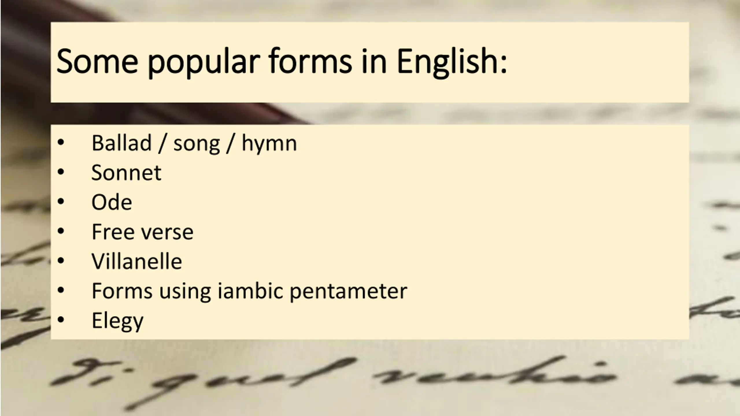 Some popular forms in English: Some popular forms in English: Ballad / song / hymn Sonnet Ode Free verse Villanelle Forms using iambic pentameter Elegy