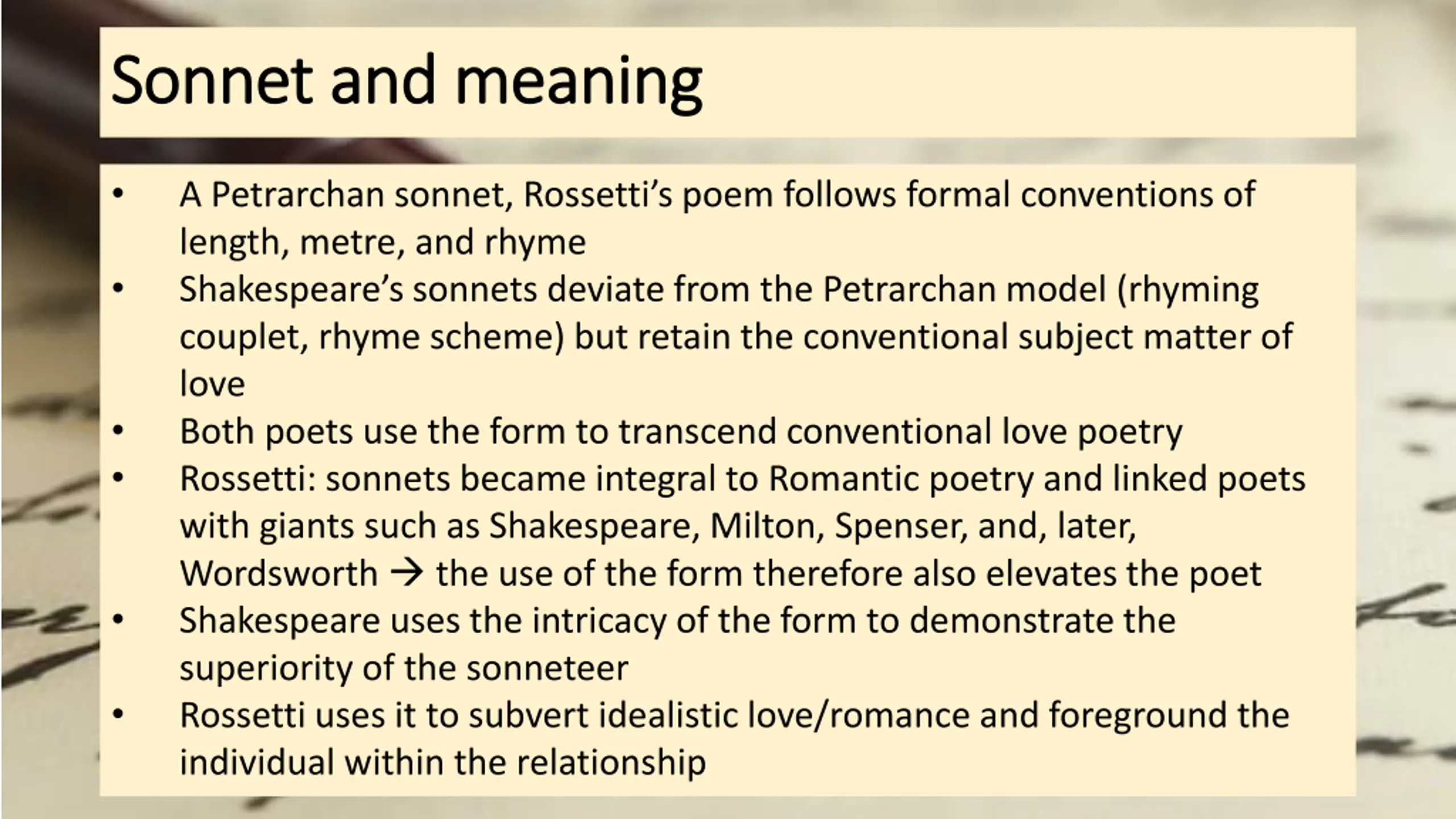 Sonnet and meaning Sonnet and meaning A Petrarchan sonnet, Rossetti s poem follows formal conventions of length, metre, and rhyme Shakespeare s sonnets deviate from the Petrarchan model (rhyming couplet, rhyme scheme) but retain the conventional subject matter of love Both poets use the form to transcend conventional love poetry Rossetti: sonnets became integral to Romantic poetry and linked poets with giants such as Shakespeare, Milton, Spenser, and, later, Wordsworth the use of the form therefore also elevates the poet Shakespeare uses the intricacy of the form to demonstrate the superiority of the sonneteer Rossetti uses it to subvert idealistic love/romance and foreground the individual within the relationship