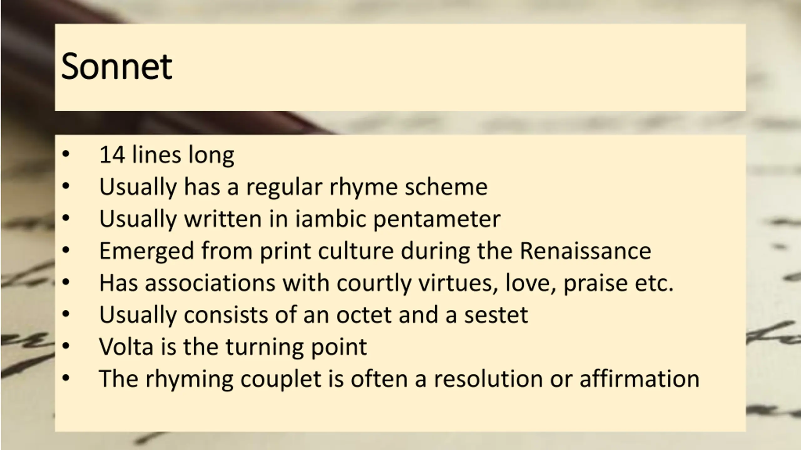Sonnet Sonnet 14 lines long Usually has a regular rhyme scheme Usually written in iambic pentameter Emerged from print culture during the Renaissance Has associations with courtly virtues, love, praise etc. Usually consists of an octet and a sestet Volta is the turning point The rhyming couplet is often a resolution or affirmation