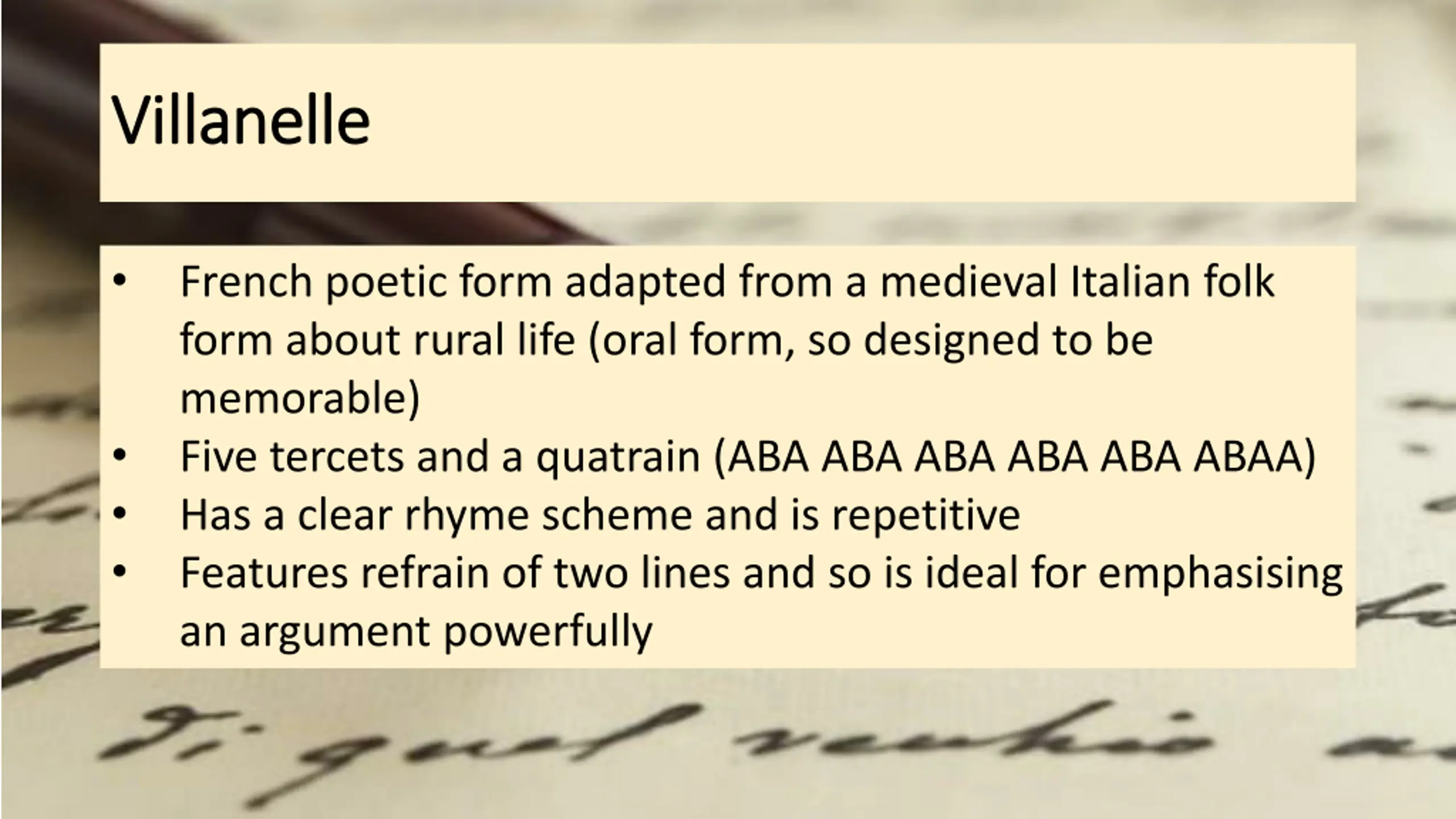 Villanelle Villanelle French poetic form adapted from a medieval Italian folk form about rural life (oral form, so designed to be memorable) Five tercets and a quatrain (ABA ABA ABA ABA ABA ABAA) Has a clear rhyme scheme and is repetitive Features refrain of two lines and so is ideal for emphasising an argument powerfully
