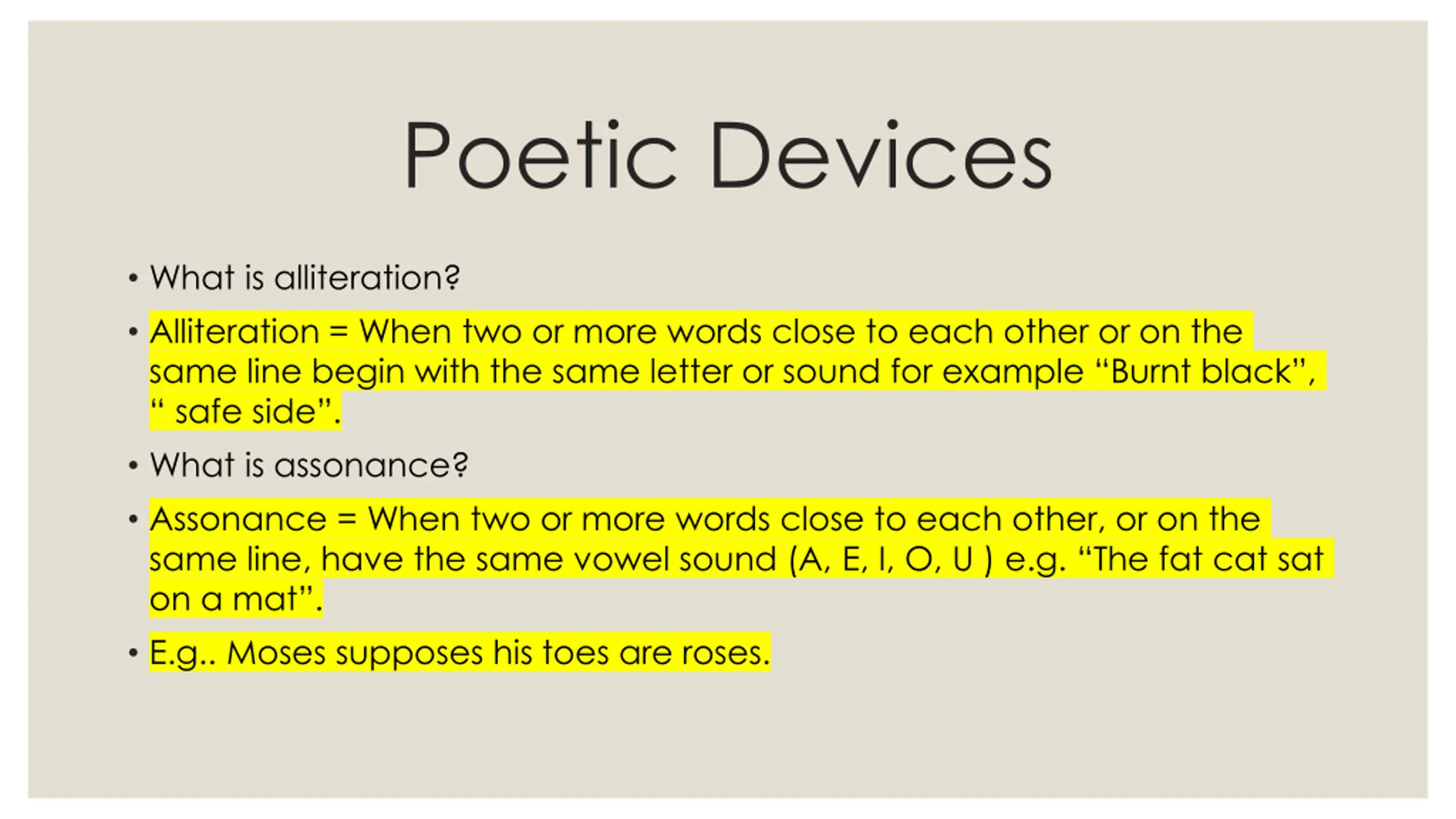 Poetic Devices What is alliteration? Alliteration = When two or more words close to each other or on the same line begin with the same letter or sound for example Burnt black , safe side . What is assonance? Assonance = When two or more words close to each other, or on the same line, have the same vowel sound (A, E, I, O, U ) e.g. The fat cat sat on a mat . E.g.. Moses supposes his toes are roses.