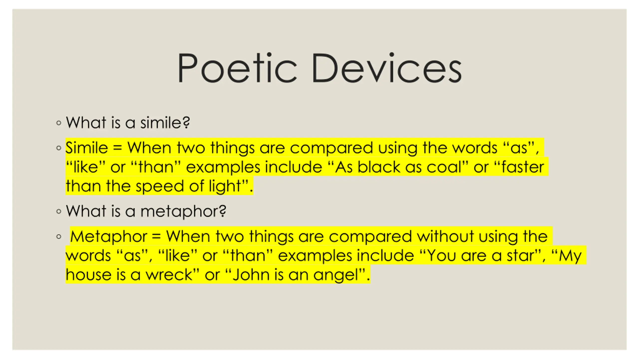 Poetic Devices What is a simile? Simile = When two things are compared using the words as , like or than examples include As black as coal or faster than the speed of light . What is a metaphor? Metaphor = When two things are compared without using the words as , like or than examples include You are a star , My house is a wreck or John is an angel .
