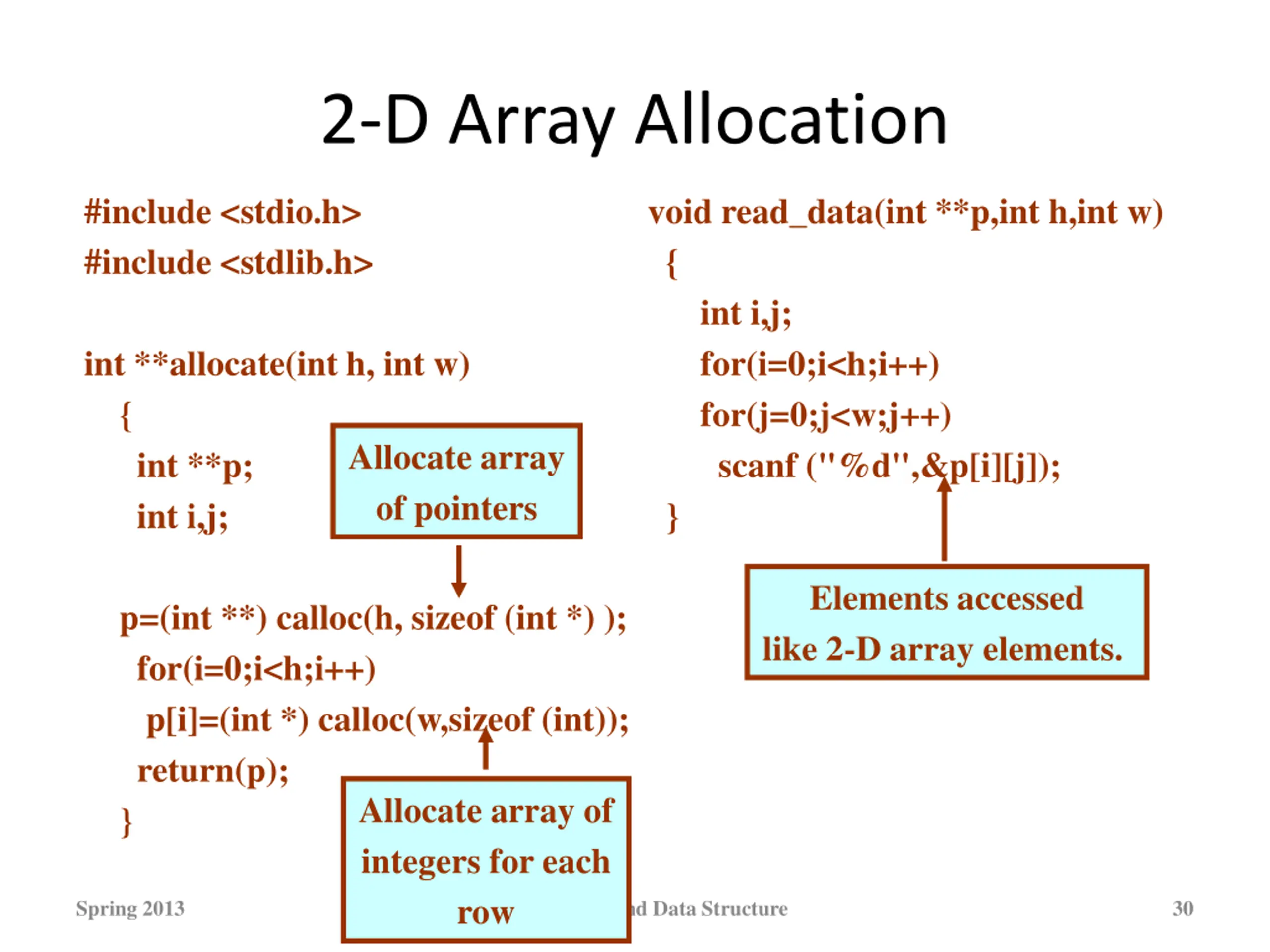 2-D Array Allocation #include <stdio.h> #include <stdlib.h> void read_data(int **p,int h,int w) { int i,j; for(i=0;i<h;i++) for(j=0;j<w;j++) scanf ("%d",&p[i][j]); } int **allocate(int h, int w) { int **p; int i,j; p=(int **) calloc(h, sizeof (int *) ); for(i=0;i<h;i++) p[i]=(int *) calloc(w,sizeof (int)); return(p); } Allocate array of pointers Elements accessed like 2-D array elements. Allocate array of integers for each Programming and Data Structure row Spring 2013 30