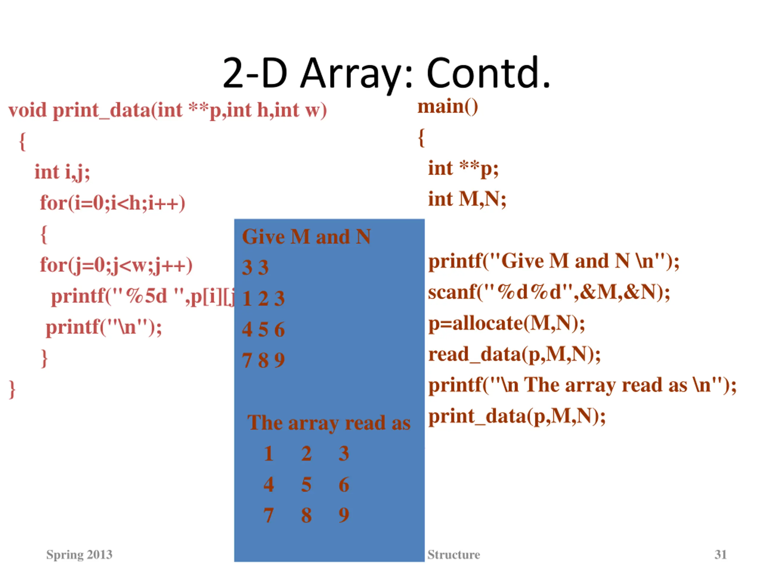 2-D Array: Contd. main() { int **p; int M,N; void print_data(int **p,int h,int w) { int i,j; for(i=0;i<h;i++) { for(j=0;j<w;j++) printf("%5d ",p[i][j]); printf("\n"); } } Give M and N 3 3 1 2 3 4 5 6 7 8 9 printf("Give M and N \n"); scanf("%d%d",&M,&N); p=allocate(M,N); read_data(p,M,N); printf("\n The array read as \n"); print_data(p,M,N); } The array read as 1 2 3 4 5 6 7 8 9 Spring 2013 Programming and Data Structure 31